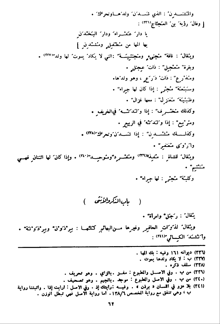 والمُشْدِنُ: الَّذِي شَدَنَ ولدُها وتحرَّكَ. [وَقَالَ رؤبةُ بنُ العَجَّأج (336) : يَا دارُ عَفْراءَ ودارَ البَخْدَنِ بهَا المها من مُطْفِلٍ ومُشْدِنِ] ويُقالُ: ناقةٌ مُجْئٍ ومُجْئِيَةٌ: الَّتِي لَا يكادُ يموتُ لَهَا ولدٌ (337) . وبقرةٌ مُعْجِلٌ: ذاتُ عِجْلٍ. ومُذْرِعٌ: ذَات ذَرَعٍ، وَهُوَ ولدُها. وسَبُعَةٌ مُجْرٍ: إِذا كَانَ لَهَا جِراءٌ. وظَبْيَةٌ مُغْزِلٌ: مَعهَا غزالٌ. وَكَذَلِكَ مُخْرِفٌ: إِذا وَلَدَتْهُ فِي الخريفِ. ومُرْبعٌ: إِذا وَلَدَتْهُ قي الربيعِ. وَكَذَلِكَ مُشْدِنٌ: إِذا شَدَنَ وتحرَّكَ (338) . وأَرْوَى مُغْفِرٌ. ويُقالُ للشاةِ: مُفْذٌّ (339) ومُفْرِدٌ ومُوحِدٌ (340) . وَإِذا كَانَ لَهَا اثنانِ فَهِيَ مُتْئِمٌ. وكلبَةٌ مُجْرٍ: لَهَا جِراءٌ.
