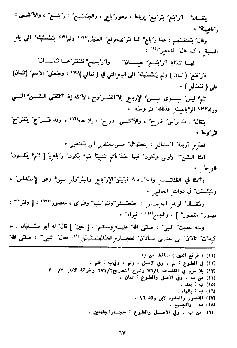 يُقالُ: أَرْبَعَ يُرْبِعُ إرباعاً، وَهُوَ رَباعٍ، والجَمْعُ: رُبْعٌ، والأُنثى: رَباعِيَةٌ. وقالَ بَعضُهم: هَذَا رَباعٌ كَمَا تَرَى، فرفعَ العَيْنَ (11) وَلم (12) يَنْسُبْهُ إِلَى ياءِ النسبةِ، كَمَا قالَ الشاعِرُ (13) : لَهَا ثَنَايا أَرْبَعٌ حِسانٌ وأَرْبعٌ فَثَغْرُها ثَمانْ فَرَفَعَ (ثَمَان) وَلم يَنْسُبْهُ إِلَى الياءِ الَّتِي فِي (ثَمَانِي) (14) ، وجَعَلَ الاسْمَ (ثَمان) على (فَعَالٍ) . ثُمَّ ليسَ سِوى سِنِّ الإرباعِ إلاّ القُرُوح، لأَنَّه إِذا أَلْقَى السِّنَّ الَّتِي وراءَ (15) الرِّباعِيَةِ فذلكَ قُرُوحُهُ. يُقالُ: فَرَسٌ قارِحٌ، والأُنثى: قارِحٌ، بِلَا هَاء (16) . وَقد قَرَحَ يَقْرِحُ قُرُوحاً. فهذِهِ أربعةُ أَسْنانٍ، يتحَوَّلُ من بَعْضٍ إِلَى بَعْضٍ. أمَّا السِّنُّ الأولى فيكونُ فِيهَا جَذَعاً ثمَّ ثَنِيّاً ثُمَّ يكونُ رَباعِياً [ثُمَّ يكونُ قارِحاً] . وأَمَّا فِي الظِّلْفِ والخُفِّ فبَيْنَ الإرْباعِ والبُزُول سِنٌّ وَهُوَ الإِسْداسُ، ولَيْسَتْ فِي ذواتِ الحافِرِ. ويُقالُ لولدِ الحِمارِ: جَحْشٌ وتَوْلَبٌ وفَرّى، مقصورٌ (17) ، [وفَرَأٌ، مهموزٌ مقصورٌ] ، وَالْجمع (18) : فِراءٌ. وَمِنْه حَدِيث النبيّ، صلّى الله عليهِ وسَلَّمَ، [حينَ] قالَ لَهُ أَبُو سُفيان: مَا كِدْتَ تأذَنُ لي حَتَّى تَأذَنَ لحجارةِ الجُلْهُمَتَيْنِ (19) فقالَ النبيُّ، صلّى اللهُ