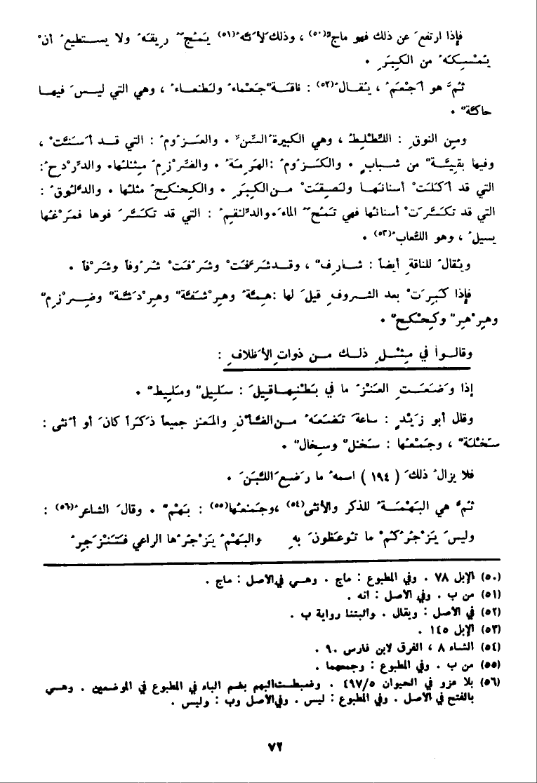 فَإِذا ارتفعَ عَن ذَلِك فَهُوَ ماجٌّ (50) ، وذلكَ لأَنَّه (51) يَمُجُّ رِيقَهُ وَلَا يستطيعُ أنْ يُمْسِكَهُ من الكِبَرِ. ثُمَّ هُوَ أَجْعَمُ، يُقال (52) : ناقَةٌ جَعْماءُ ولَطْعاءُ، وَهِي الَّتِي ليسَ فِيهَا حاكَّةٌ. ومِن النوقِ: اللِّطْلِطُ، وَهِي الكبيرةُ السِّنِّ. والعَزُومُ: الَّتِي قد أَسَنَّتْ، وفيهَا بقِيَّةٌ من شبابٍ. والكَزُومُ: الهَرِمَةُ. والضِّرْزِمُ مِثْلُها. والدِّرْدحُ: الَّتِي قد أَكَلَتْ أسنانَها ولَصِقَتْ من الكِبَرِ. والكِحكِحُ مثلهَا. والدِّلُوقُ: الَّتِي قد تكَسَّرَتْ اسنانُها فَهِيَ تَمُحُّ الماءَ والدِّلْقِمُ: الَّتِي قد تكَسَّرَ فوها فمَرْغُها يسيلُ، وَهُوَ اللُّعابُ (53) . ويُقالُ للناقةِ أَيْضا: شارِفٌ، وَقد شَرَّفَتْ وشَرُفَتْ شُرُوفاً وشَرْفاً. فَإِذا كَبِرَتْ بعد الشروفِ قيلَ لَهَا: هِمَّةُ وهِرْشَفَّةٌ وهِرْدَشَّةٌ وضِرْزِمٌ وهِرْهِرٌ وكِحْكِحٌ. وَقَالُوا فِي مِثْلِ ذَلِك من ذواتِ الأَظلافِ: إِذا وَضَعَتِ العَنْزُ مَا فِي بَطْنِها قِيلَ: سَلِيلٌ ومَلِيطٌ. وَقَالَ أَبُو زَيْدٍ: ساعةَ تَضَعَهُ من الضَّأْنِ والمَعْز جَمِيعًا ذَكَراً كانَ أَو أثنى: سَخْلَةٌ، وجَمْعُها: سَخْلٌ وسِخالٌ. فَلَا يزَال ذلكَ (194) اسمهُ مَا رَضعَ اللَّبَنَ. ثُمَّ هِيَ البَهْمَةُ للذّكر وَالْأُنْثَى (54) ، وجَمْعُها (55) : بَهْمٌ. وقالَ الشاعرُ (56) : وليسَ يَزْجُرُكُمْ مَا تُوعَظونَ بهِ والبضهْمُ يَزْجُرُها الرَّاعِي فَتَنْزَجِرُ