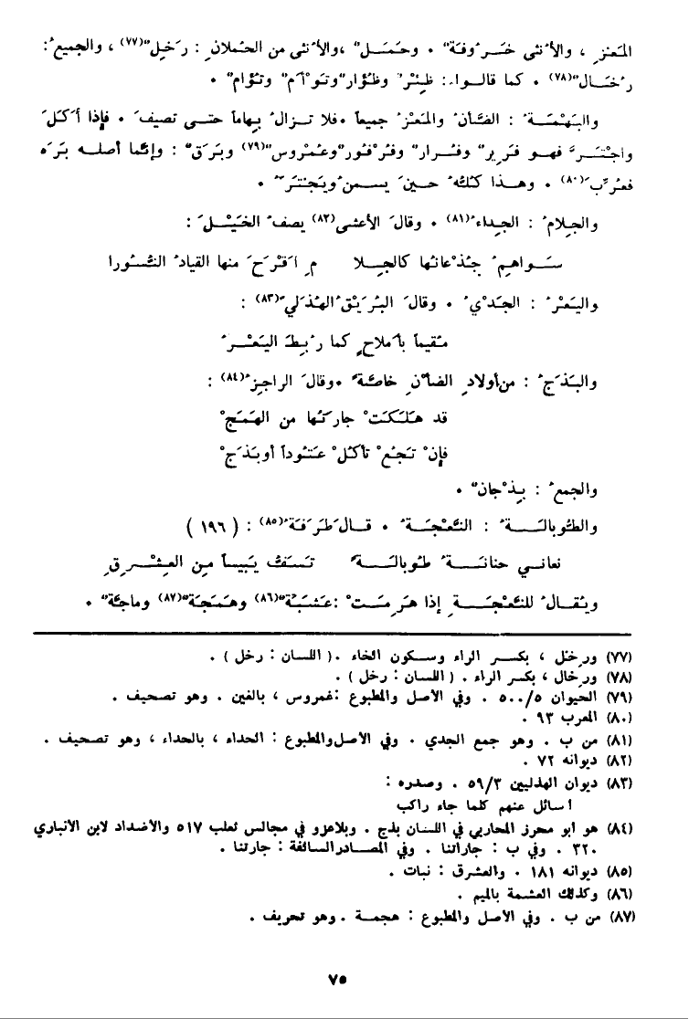 المَعْزِ، والأُنثى خَرُوفَةٌ. وحَمَلٌ، والأُنثى من الحُملانِ: رَخِلٌ (77) ، والجميعُ: رُخَالٌ (78) . كَمَا قَالُوا: ظِئْرٌ وظُؤارٌ وتَوْأَمٌ وتُؤامٌ. والبَهْمَةُ: الضَّأنُ والمَعْزُ جَمِيعًا. فَلَا تزالُ بِهاماً حَتَّى تصيفَ. فَإِذا أَكَلَ واجْتَرَّ فَهُوَ فَرِيرٌ وفُرارٌ وفُرْفُورٌ وعُمْروسٌ (79) وبَرَقٌ: وإنَّما أَصله بَرَه فعُرِّبَ (80) . وَهَذَا كُلُّهُ حينَ يسمنُ ويَجْتَرُّ. والجِلامُ: الجِداءُ (81) ، وقالَ الْأَعْشَى (82) يصفُ الخَيْلَ: سَواهِمُ جُذْعانُها كالجِلامِ أَقْرَحَ مِنْهَا القيادُ النُّسُورا واليَعْرُ: الجَدْيُ. وقالَ البُرَيْقُ الهُذَليّ (83) : مُقيماً بأَملاحٍ كَمَا رُبِطَ اليَعْرُ والبَذَجُ: من أولادِ الضأْنِ خاصَّةً. وقالَ الراجِزُ (84) : قد هَلَكَتْ جارَتُها من الهَمَجْ فإنْ تَجُعْ تأكُلْ عَتُوداً أَو بَذَجْ والجمعُ: بِذْجانٌ. والطُّوبالَةُ: النَّعْجَةُ. قالَ طَرَفَةُ (85) : (196) نعاني حنانَةُ طُوبالَةً تَسَفُّ يَبيساً مِن العِشْرِقِ ويُقالُ للنَّعْجَةِ إِذا هَرِمَتْ: عَشَبَةٌ (86) وهَمَجَةٌ (87) وماجَّةٌ.
