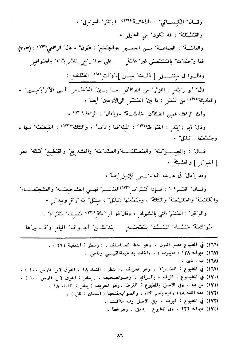 وقالَ الْكسَائي: النُّخَّة (166) : البَقَرُ العوامِلُ. والقَنْبَلَةُ: قد تكونُ منِ الخَيْلِ. والعانَةُ: الجماعةُ من الحميرِ، والجَمْعُ: عُونٌ. قَالَ الرَّاعي (167) (203) فَمَا وَجَدَتْ بالمُنْتَصَى غيرَ عانَةٍ على حَشْرَجٍ يَضْرِبْنَهُ بالحَوافِرِ وَقَالُوا فِي مِثْل [ذلكَ منِ] ذَوَاتٍ (168) الظِّلْفِ: قالَ أَبُو زيْدٍ: الفزْرُ من الضَّأْنِ: مَا بينَ العَشْرِ إِلَى الأَرْبَعِينَ. والصُّبَّة (169) من المَعْزِ: مَا بينَ العَشْرِ إِلَى الأربعينَ أَيْضا. وأمَّا الرِّفُّ فمِن الضَّأْنِ خاصَّةً. ويُقالُ: الرَّفُّ (170) . وقالَ أَبُو زَيْدٍ: القَوْطُ (171) : المِئةُ فَمَا زادَتْ. والثَّلَّةُ (172) : القِطْعَةُ مِنْهَا، وجَمْعُها: ثِلَلٌ. قالَ: والجِزْمَةُ والقَصْلَةُ والصِّدْعَةُ والصَّدِيعُ والقَطِيعُ كُلُّهُ نَحْو [الفِزْرِ] والصُّبَّةِ. وَقد يُقالُ فِي هَذِه الخَمْسِ للإبِلِ أَيْضا. وقالَ الفَرَّاءُ: فَإِذا كَثُرَتِ (173) الغَنَمُ فَهِيَ الضَّاجِعَةُ والضَّجْعاءُ والكَلْعَةُ والعُلَيْطَةُ والثَّلَّةُ، وجَمْعُها: ثِلَلٌ، مِثْلُ بَدْرَةٍ وبَدَرٍ. والوَقيرُ: الغَنَمُ الَّتِي بالسَّوادِ. وقالَ ذُو الرُّمَّةِ (174) يَصِفُ بَقَرَةً: مُوَلَّعَةً خَنْساءَ لَيْسَتْ بنَعْجَةٍ يُدَمِّنُ أجوافَ المياهِ وَقيرُها