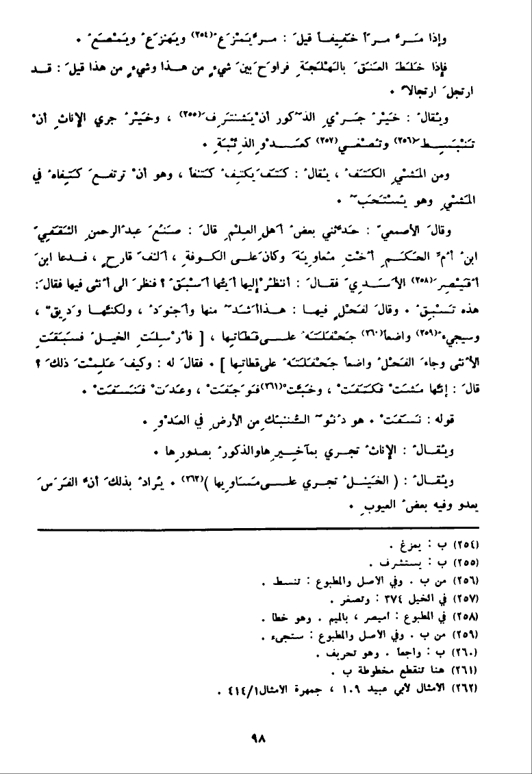وَإِذا مَرَّ مرّاً خَفِيفاً قيلَ: مرَّ يَمْزَعُ (254) ويَهْزَعُ ويَمْصَعُ. فَإِذا خَلَطَ العَنَقَ بالَهْلَجَةِ فراوَحَ بينَ شيءٍ من هَذَا وشيءٍ من هَذَا قيلَ: قد ارتجلَ ارتجالاً. ويُقالُ: خَيْرُ جَرْيِ الذُّكون أنْ يَشْتَرِفَ (255) ، وخَيْرُ جري الإناثِ أنْ تَنْبَسِطَ (256) وتُصْغي (257) كعَدْوِ الذِئْبَةِ. وَمن المَشْيِ الكَتَفُ، يُقالُ: كَتَفَ يكتِفُ كَتْفاً، وَهُوَ أنْ ترتفعَ كَتِفاهُ فِي المَشْيِ وَهُوَ يُسْتَحَبُّ. وقالَ الأصمعيّ: حَدَّثني بعضُ أَهلِ العِلْمِ قالَ: صَنُعَ عبدُ الرحمنِ الثَقَفِيّ ابنُ أُمِّ الحَكَمِ أُخْتِ مُعاوِيَةَ وَكَانَ على الكوفةِ، أَلْفَ قارِحٍ، فَدَعَا ابْن أُقَيْصِرَ (258) الأَسَدِيّ فقالَ: أنْظُرْ إِلَيْهَا أَيُّها أَسْبَقُ؟ فنظرَ إِلَى أُنثى فِيهَا فقالَ: هَذِه تَسْبِقُ. وقالَ لفَحْلٍ فِيهَا: هَذَا أِشَدُّ مِنْهَا وأَجْوَدُ، ولكنَّها وَدِيقٌ، وسيجيءُ (259) وَاضِعا (260) جَحْفَلَتَهُ على قَطَاتِها، [فأُرْسِلَتِ الخيلُ فسَبَقَتِ الأُنثى وجاءَ الفَحْلُ وَاضِعا جَحْفَلَتَهُ على قطاتِها] . فقالَ لَهُ: وكيفَ عَلِمْتَ ذلكَ؟ قالَ: إنَّها مَشَتْ فَكَتَفَتْ، وخَبَّتْ (261) فَوَجَفَتْ، وعَدَتء فَنَسَفَتْ. قَوْله: نَسَفَتْ. هُوَ دُنُوُّ السُّنْبُكِ من الأرضِ فِي العَدْوِ. ويُقالُ: الإناثُ تجْرِي بمآخِيرِها والذكورُ بصدورِها. ويُقالُ: (الخَيْلُ تجْرِي على مَسَاوِيها) (262) . يُرادُ بذلكَ أنَّ الفَرَسَ يعدو وَفِيه بعضُ العيوبِ.