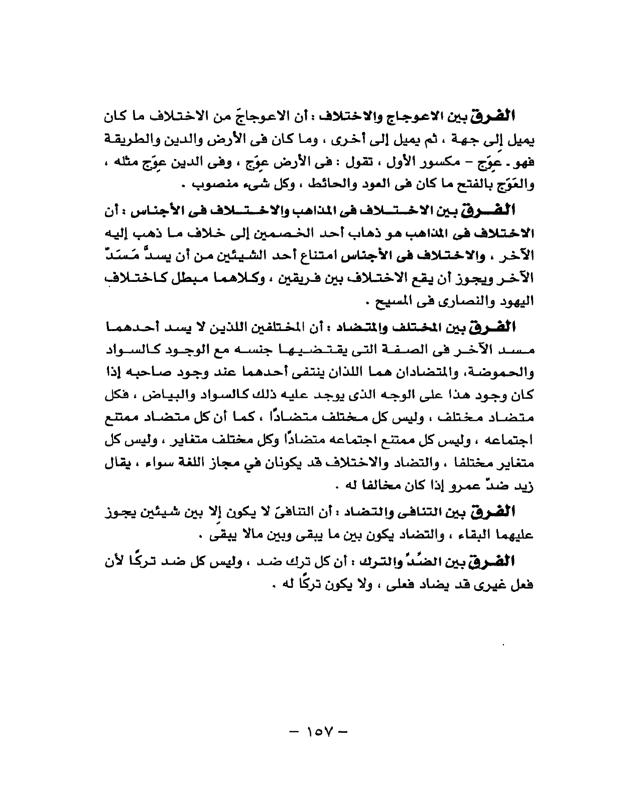 أَن امختلفين هما اللَّذَان لَا يسد أَحدهمَا مسد الآخر فِي الصّفة الَّتِي يقتضيها جنسه مَعَ الْوُجُود كالسواد الحموضة والتضادين هما اللَّذَان يَنْتَفِي أَحدهمَا عِنْد وجود كالسواد والحموضة والمتضادين هما اللَّذَان يَنْتَفِي أَحدهمَا عِنْد وجود صَاحبه إِذا كَانَ وجو هَذَا على الْوَجْه الَّذِي يُوجد عَلَيْهِ ذَلِك كالسواد وَالْبَيَاض فَكل متضادين مُخْتَلِفَانِ وَلَيْسَ كل مُخْتَلفين متضادين كَمَا أَن كل متضادين مُمْتَنع اجْتِمَاعهمَا وَلَيْسَ كل مُمْتَنع اجتماعها متضادين وكل مُخْتَلفين متغايران وَلَيْسَ كل متغايرين ختلفين والتضاد وَالِاخْتِلَاف قد يكونانا فِي مجَاز اللُّغَة سَوَاء يُقَال زيد ضد عَمْرو إِذا كَانَ مُخَالفا لَهُ