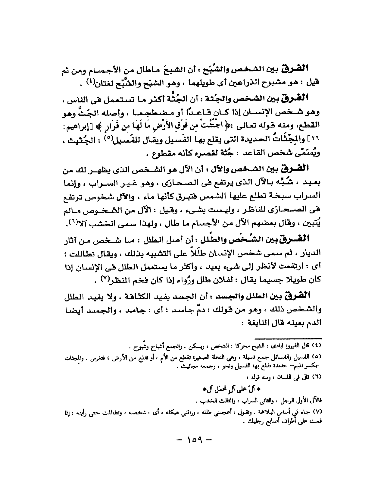 أَن الجثة أَكثر مَا تسْتَعْمل فِي النَّاس وَهُوَ شخص الْإِنْسَان إِذا كَانَ قَاعِدا أَو مُضْطَجعا وَأَصله الجث وَهُوَ الْقطع وَمِنْه قَوْله تَعَالَى (اجتثت من فَوق الأَرْض) والمجثات الحديدة الَّتِي يقْلع بهَا الفسيل وَيُقَال للفسيل الجثيث فيسمى شخص الْقَاعِد جثه لقصره كانه مَقْطُوع