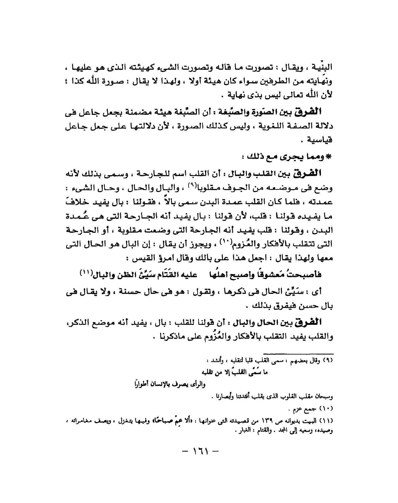 أَن الْقلب اسْم للجارحة وَسمي بذلكلأنه وضع فِي مَوْضِعه من الْجوف مقلوبا والبال هُوَ الْحَال وَحَال الشَّيْء عمدته فَلَمَّا كَانَ الْقلب عُمْدَة الْبدن سمي بَالا فقولنا بَال يُفِيد خلاف مَا يفيجه قَوْلنَا قلب لِأَن قَوْلنَا بَال يُفِيد أَنه الْجَارِحَة الَّتِي هِيَ عمده البد وَقَوْلنَا قلب يُفِيد أَنه الْجَارِحَة الَّتِي وضعت مقوبة أَو الْجَارِحَة الَّتِي تتقلب بالأفكار والعزوم وَيجوز أَن يُقَال إِن البال هُوَ الْحَال الَّتِي مَعهَا وَلِهَذَا يُقَال اجْعَل هَذَا على بالك وَقَالَ أمرؤ الْقَيْس من الطَّوِيل