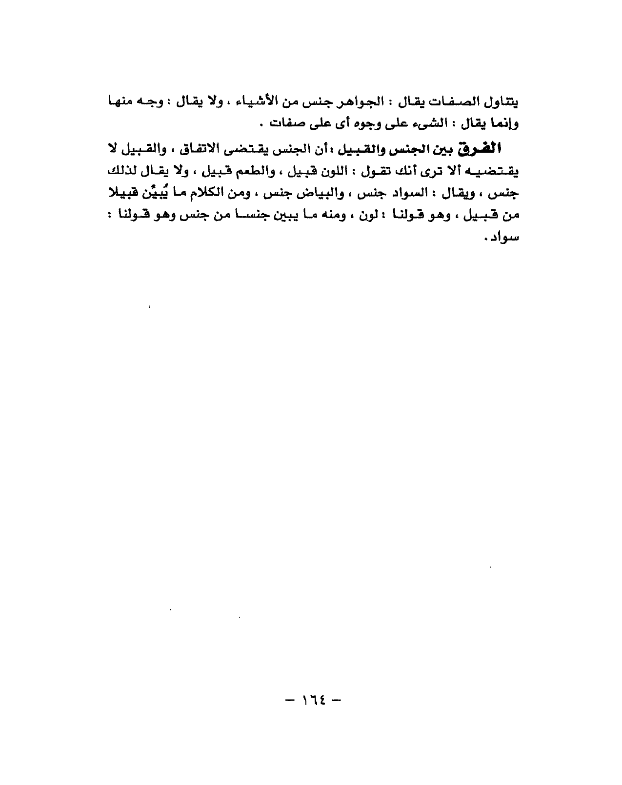 أَن الْجِنْس يَقْتَضِي الِاتِّفَاق والقبيل لَا يَقْتَضِيهِ أَلا ترى أَنَّك تَقول اللَّوْن قبيل والطعم قبيل وَلَا يُقَال لذَلِك جنس وَيُقَال السوَاد جنس وَالْبَيَاض جنس وَمن الْكَلَام مَا يبين قبيلا وَهُوَ قَوْلنَا وَمِنْه مَا يبين من جنس وَهُوَ قَوْلنَا سَواد
