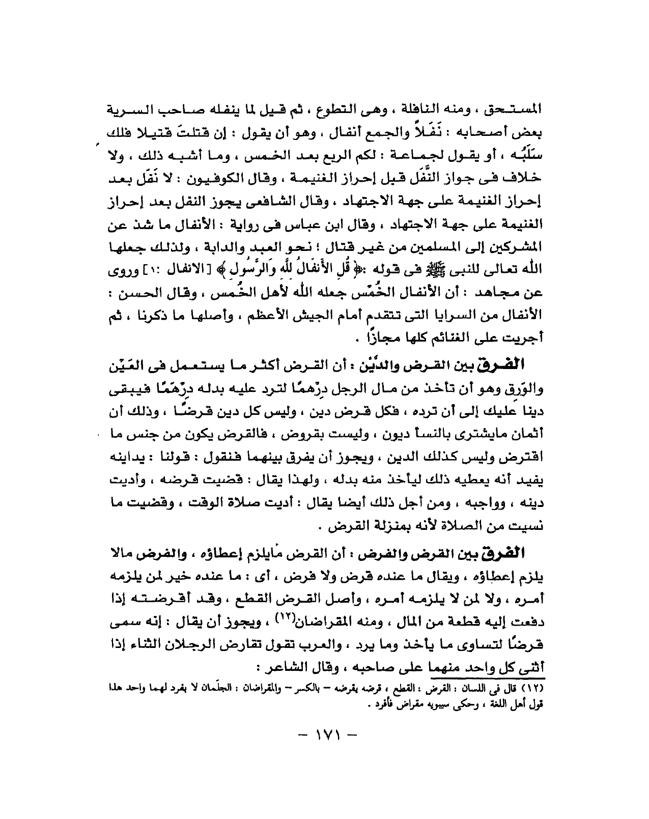 أَن الْقَرْض أَكثر مَا يسْتَعْمل فِي الْعين وَالْوَرق وَهُوَ أَن تَأْخُذ من مَال الرجل درهما لِترد عَلَيْهِ بدله درهما فَيبقى دينا عَلَيْك إِلَى أَن ترده فَكل قرض دين لَيْسَ كل دين قرضا وَذَلِكَ أَن أَثمَان مَا يَشْتَرِي بالنسإ دُيُون وَلَيْسَت بقروض فالقرض يكون من جنس مَا اقْترض وَلَيْسَ كَذَلِك الدّين وَيجوز أَن يفرق بَينهمَا فَنَقُول قَوْلنَا يداينه يُفِيد أَنه يُعْطِيهِ ذَلِك ليَأْخُذ مِنْهُ بدله وَلِهَذَا يُقَال قضيت قرضه وَأديت دينه وواجبه وَمن أجل أَيْضا يُقَال أدّيت صَلَاة الْوَقْت وقضيت مَا نسيت من الصَّلَاة بِمَنْزِلَة الْقَرْض