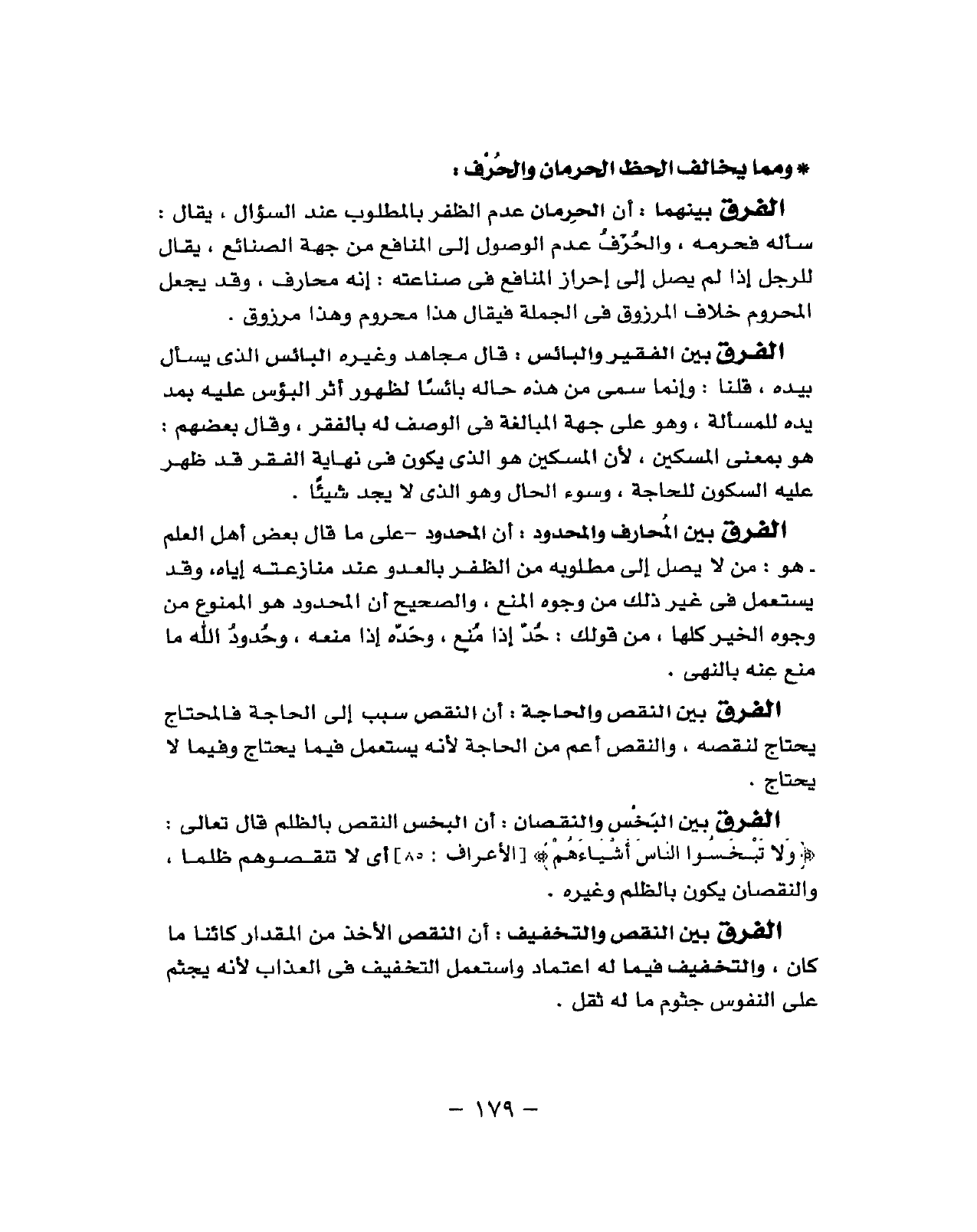 أَن الحرمان عدم الظفر بالمطلوب عِنْد السُّؤَال يُقَال سَأَلَهُ فحرمه والحرف عدم الْوُصُول إِلَى الْمَنَافِع من جِهَة الصَّنَائِع يُقَال للرجل إِذا لم يصل إِلَى إِحْرَاز الْمَنَافِع فِي صناعته إِنَّه محارف وَقد يَجْعَل المحروم خلاف المرزوق فِي الْجُمْلَة فَيُقَال هَذَا محروم وَهَذَا مَرْزُوق