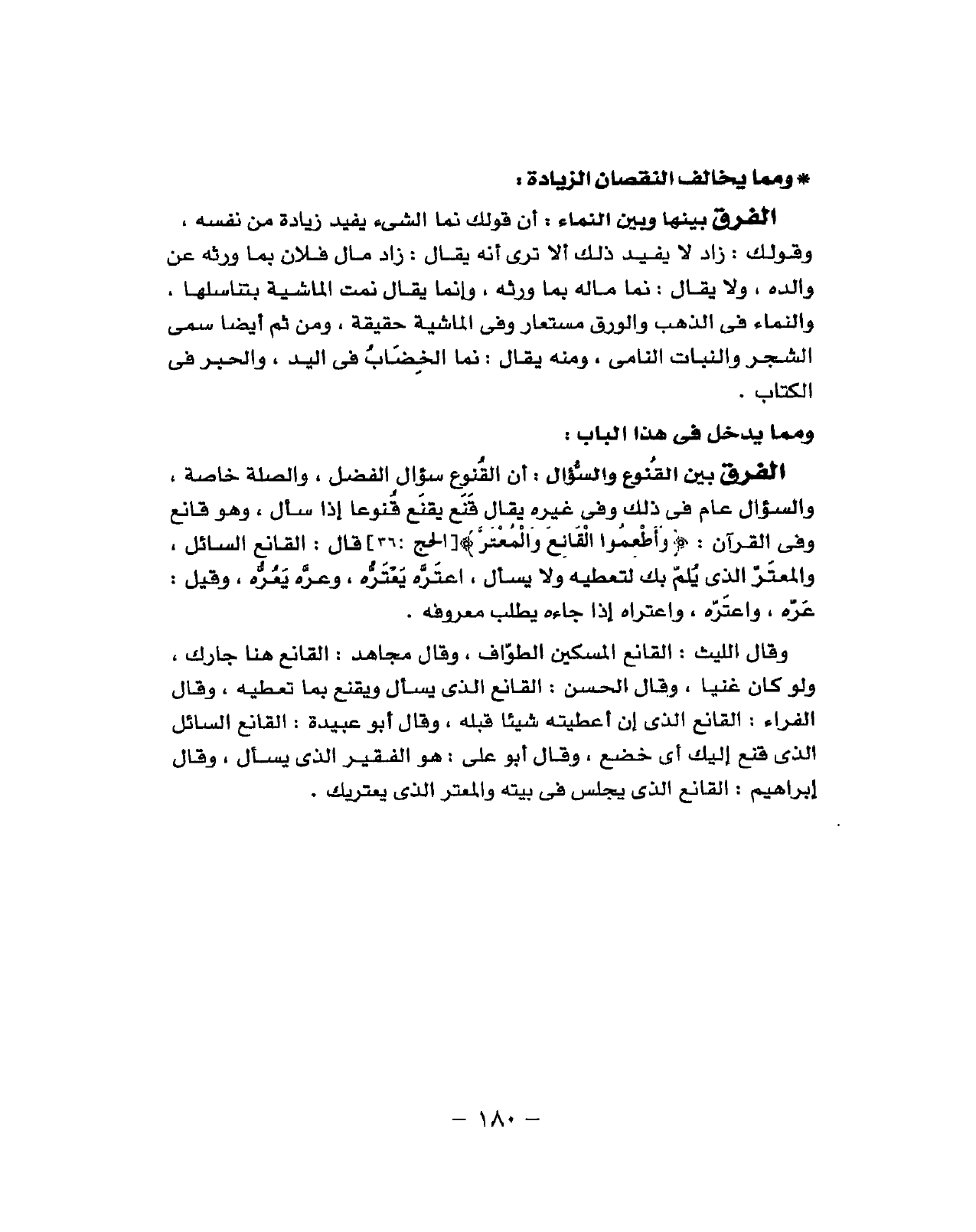 أَن القنوع سُؤال الْفضل والصلة خَاصَّة وَالسُّؤَال علام فِي ذَلِك وَفِي غَيره يُقَال قنع يقنع قنوعا إِذا سَأَلَ وَهُوَ قانه وَفِي الْقُرْآن (وأطعموا القانع والمعتر) قَالَ القانع السَّائِل والمعتر الَّذِي يلم بك لتعطية وَلَا يسْأَل اعتره يعتره وعره يعره وَقيل عره واعتره واعتراه إِذا جَاءَهُ يطْلب معوفة وَقَالَ اللَّيْث القانع الْمِسْكِين الطّواف وَقَالَ مُجَاهِد القانع هُنَا جَارك وَلَو كَانَ غَنِيا وَقَالَ الْحسن القانع الَّذِي يسْأَل ويقنع بِمَا تعطيه وَقَالَ الْفراء القانع الَّذِي إِن أَعْطيته شَيْئا قبله وَقَالَ ابو عُبَيْدَة القانع السائع الَّذِي قنع إِلَيْك أَي خضع وَقَالَ أَبُو عَليّ هُوَ الْفَقِير يسْأَل وَقَالَ إبراهم الَّذِي يجلس فِي بَيته والمعتر الَّذِي يعتريك