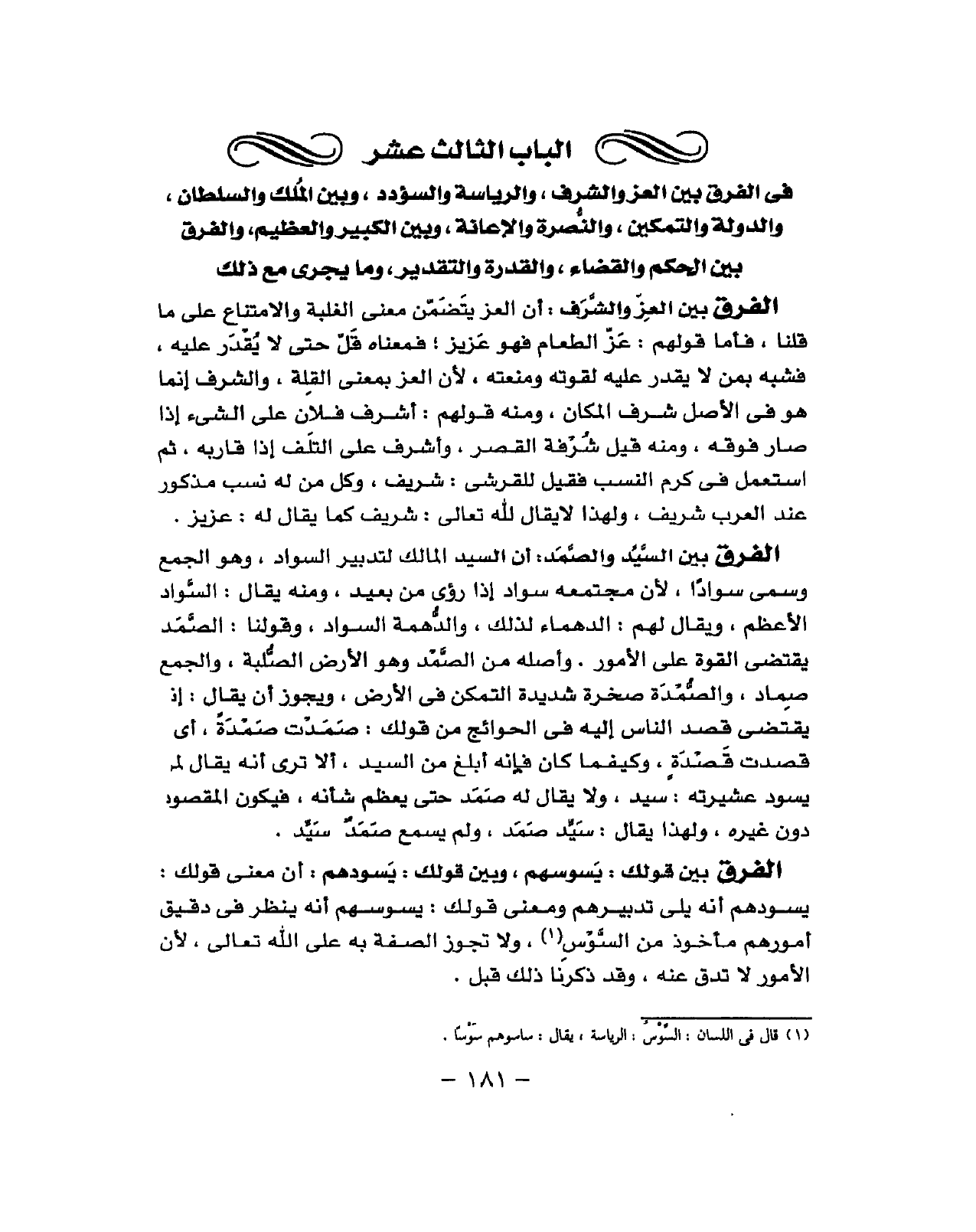 فِي الْفرق بَين الْعِزّ والشرق والرياسة والسؤدد وَبَين الْملك وَالسُّلْطَان والدولة والتمكن والنصرة والإعانة وَبَين الْكَبِير والعظيم وَالْفرق بَين الحكم وَالْقَضَاء وَالْقُدْرَة وَالتَّقْدِير وَمَا يجْرِي مَعَ ذَلِك