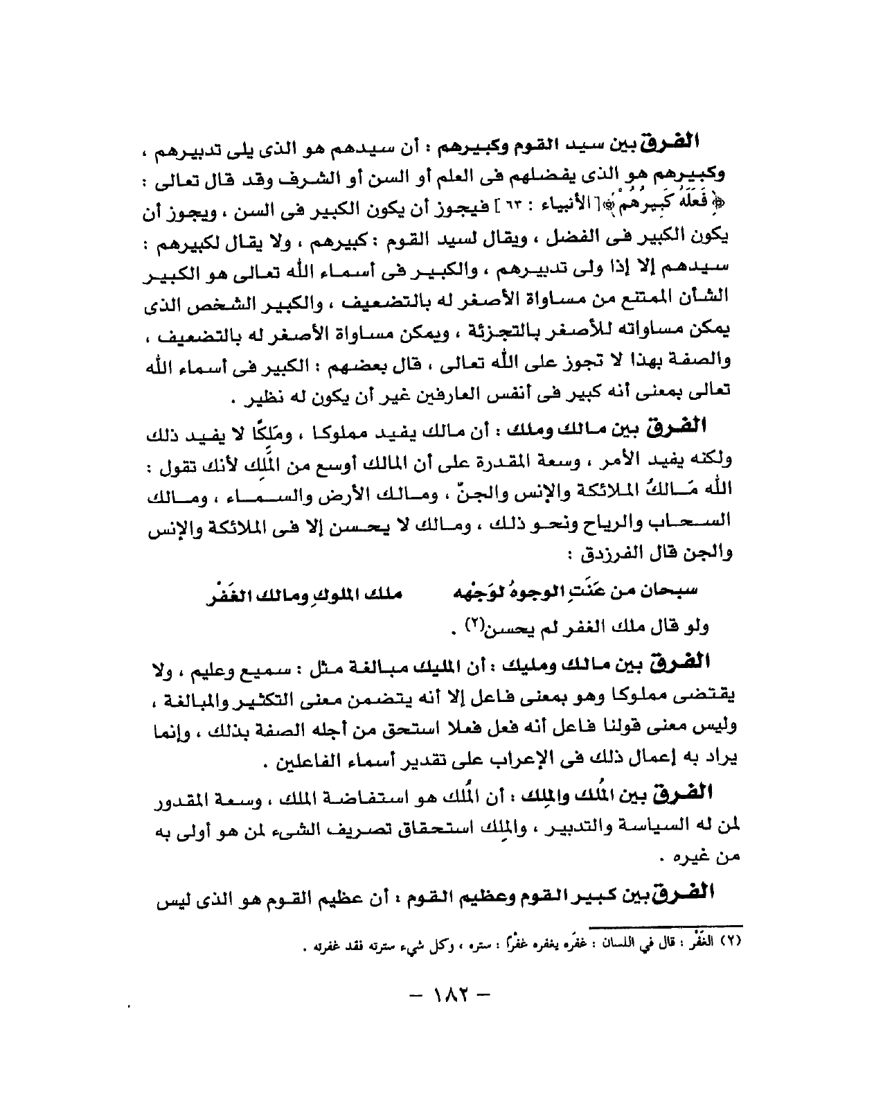 (سُبْحَانَ من عنت الْوُجُوه لوجهه ... ملك الْمُلُوك وَمَالك الغفر) وَلَو قَالَ مَالك الغفر لم يحسن