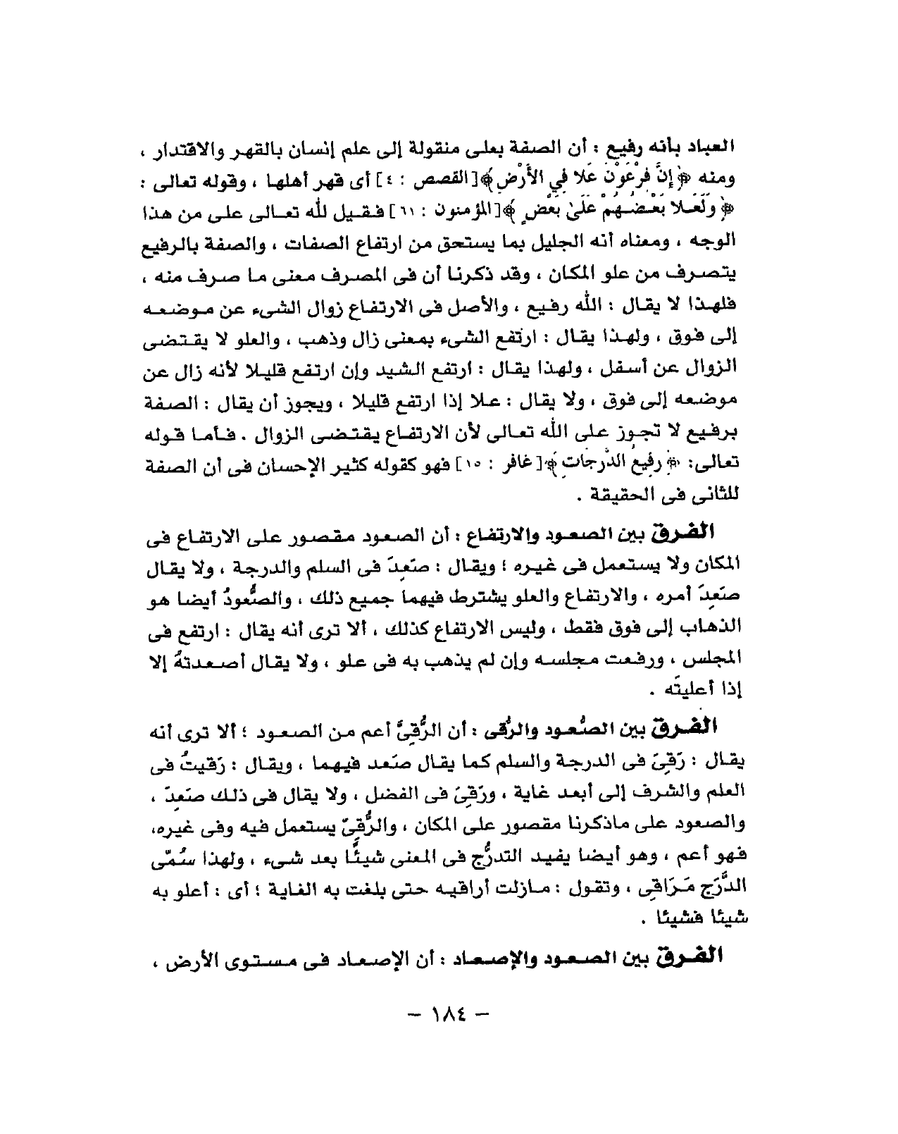 أَن الصّفة بعلي منقولة إِلَى علم إِنْسَان بالقهر والاقتدار وَمِنْه (إِن فِرْعَوْن علا فِي الأَرْض) أَي قهر أَهلهَا وَقَوله تَعَالَى (ولعلا بَعضهم على بعض) فَقيل لله تَعَالَى عَليّ من هَذَا الْوَجْه وَمَعْنَاهُ أَنه الْجَلِيل بِمَا يسْتَحق من ارْتِفَاع الصِّفَات وَالصّفة بالرفيع يتَصَرَّف من علو الْمَكَان وَقد ذكرنَا أَن فِي الْمصرف معنى مَا صرف مِنْهُ فَلهَذَا لَا يُقَال الله رفيع وَالْأَصْل فِي الِارْتفَاع زَوَال الشَّيْء عَن مَوْضِعه الى فَوق وَلِهَذَا يُقَال ارْتَفع الشَّيْء معنى زَوَال وَذهب والعلو لَا يَقْتَضِي الزَّوَال عَن أَسْفَل وَلِهَذَا يُقَال ارْتَفع اشي وَإِن ارْتَفع قَلِيلا لِأَنَّهُ زَالَ عَن مَوْضِعه إِلَى فَوق وَلَا يُقَال علا إِذا ارْتَفع فاما قَوْله تَعَالَى (رفيع الدَّرَجَات) فَهُوَ كَقَوْلِه كثير الْإِحْسَان فِي أَن الصّفة للثَّانِي فِي الْحَقِيقَة