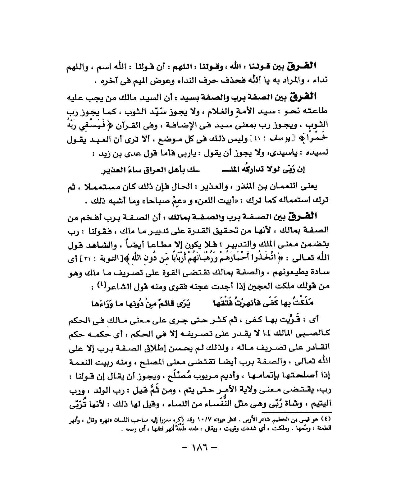أَن السَّيِّد مَالك من يجب عَلَيْهِ طَاعَته نَحْو سيد الْأمة والغلام وَلَا يجوز سيد الثَّوْب كَمَا يجوز رب لاثوب وَيجوز رب بِمَعْنى سيد فِي الْإِضَافَة وَفِي الْقُرْآن (فيسقي ربه خمرًا) وَلَيْسَ ذَلِك فِي كل مَوضِع أَلا ترى أَن العَبْد يَقُول لسَيِّده يَا سَيِّدي وَلَا يجوز أَن يَقُول يَا رَبِّي فَأَما قَول عدي بن زيد من الْخيف