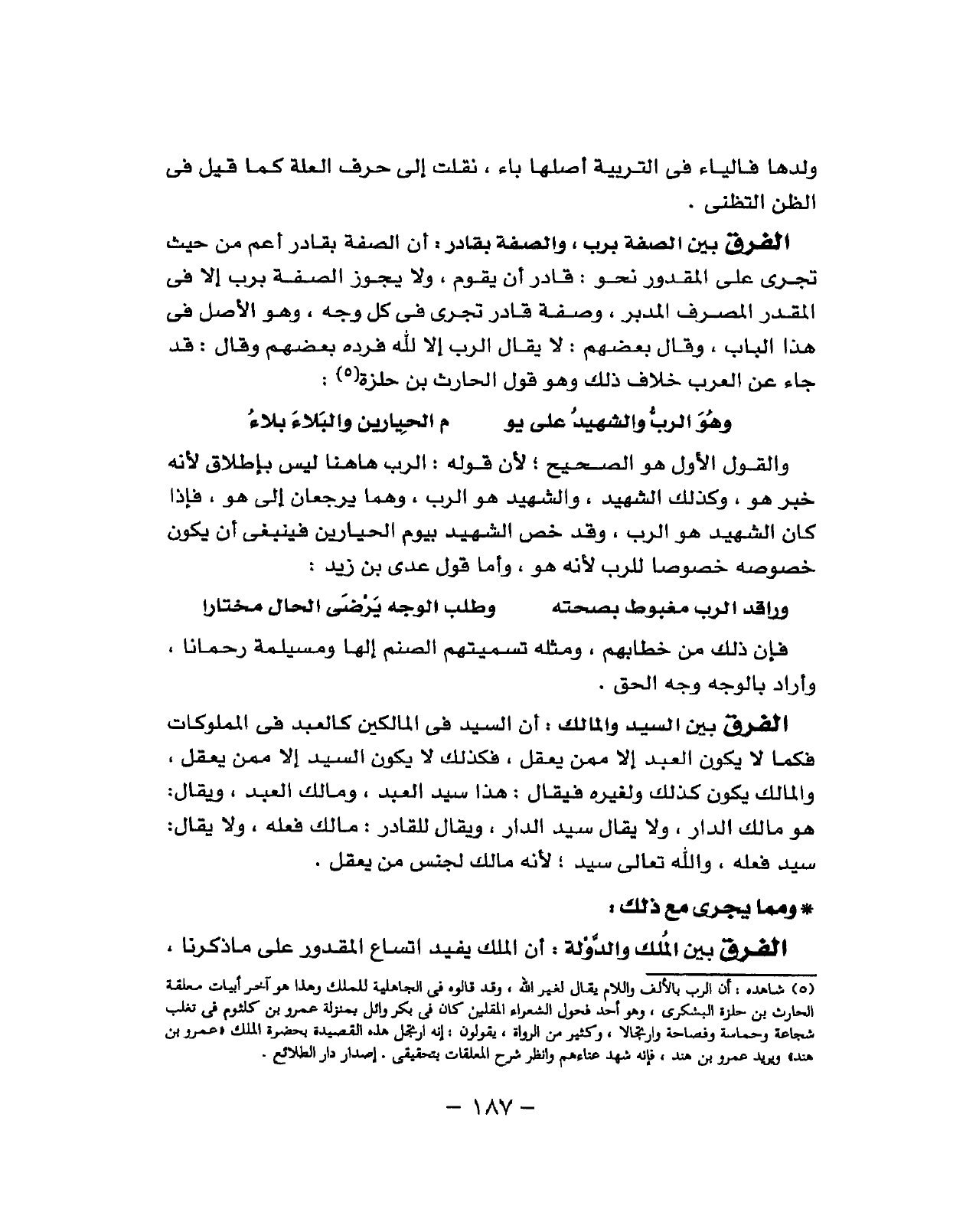أَن الصّفة بِقَادِر أَعم من حَيْثُ تجْرِي الْمَقْدُور نَحْو قَادر أَن يقوم وَلَا يجوز الصّفة بِرَبّ إِلَّا فِي الْمُقدر الْمصرف الْمُدبر وَصفَة قَادر تجْرِي فِي كل وَجه وَهُوَ الأَصْل فِي هَذَا الْبَاب وَقَالَ بَعضهم لَا يُقَال الرب إِلَّا لله فَرده بَعضهم وَقَالَ قد جَاءَ عَن الْعَرَب خلاف ذَلِك وَهُوَ قَول الْحَارِث بن حلزة (من الْخَفِيف)