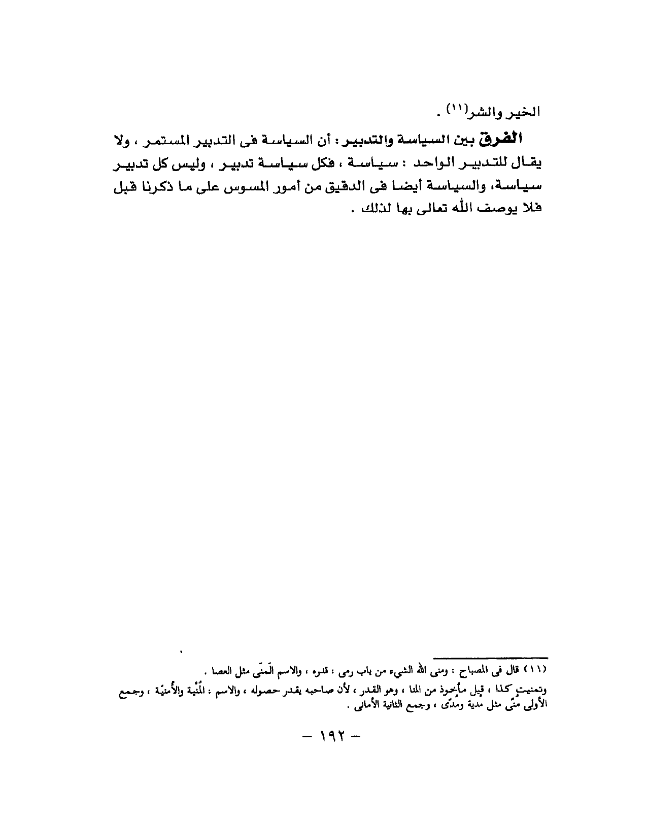 أَن السياسة فِي التدبر المستمر وَلَا يُقَال للتدبير الوحد سياسة فَكل سياسة تَدْبِير وَلَيْسَ كل تَدْبِير سياسة والسياسة أَيْضا فِي الدَّقِيق من أُمُور المسوس على مَا ذكرنَا قبل فَلَا يُوصف الله تَعَالَى بهَا لذَلِك