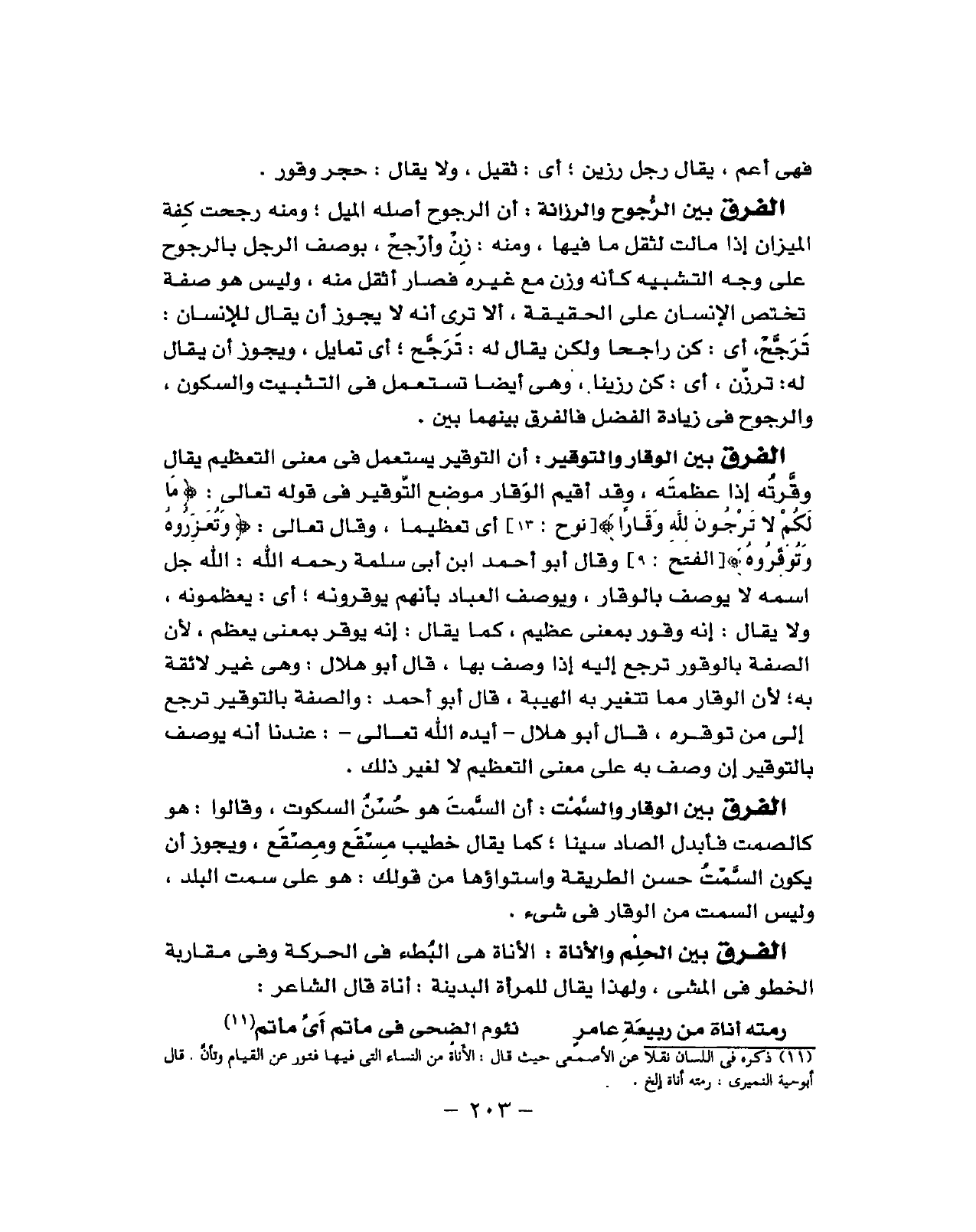 أَن الرجاحة أَصْلهَا الْميل وَمِنْهَا رجحت كفة الْمِيزَان إِذا مَالَتْ لثقل مَا فِيهَا وَمِنْهَا زن وأرجح يُوصف الرجل بالرجاحة على وَجه التَّشْبِيه كَأَنَّهُ وزن مَعَ غَيره فَصَارَ أثل مِنْهُ وَلَيْسَ هُوَ صفة تخْتَص الْإِنْسَان على الْحَقِيقَة أَلا ترى أَنه لَا يجوز أَن يُقَال للأنسان ترجح على الْحَقِيقَة أَلا ترى أنهلا يجوز أَن يُقَال للانسان ترجح أَي كن راجحا وَلَكِن يُقَال لَهُ ترجح اي تمايل وَيجوز أَن يُقَال لَهُ ترزن أَي كن رزينا وَهِي أَيْضا تسعمل فِي التثبيت والسكون والرجاحة فِي زِيَادَة الْفضل فَالْفرق بَينهمَا بَين