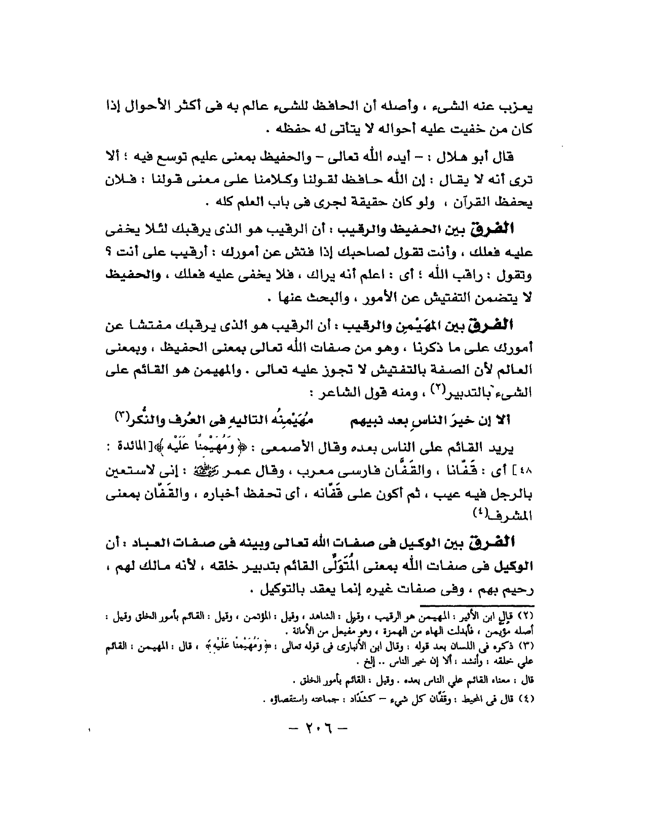 أَن الرَّقِيب هُوَ الَّذِي يرقبك فتشا عَن أمورك على مَا ذكرنَا هُوَ من صِفَات الله تَعَالَى بِمَعْنى الحفيظ وَبِمَعْنى الْعَالم لِأَن الصّفة بالتفتيش لَا تجوز عَلَيْهِ تَعَالَى والمهيمن هُوَ الْقَائِم على الشَّيْء بِالتَّدْبِيرِ وَمِنْه قَول الشَّاعِر من الطَّوِيل