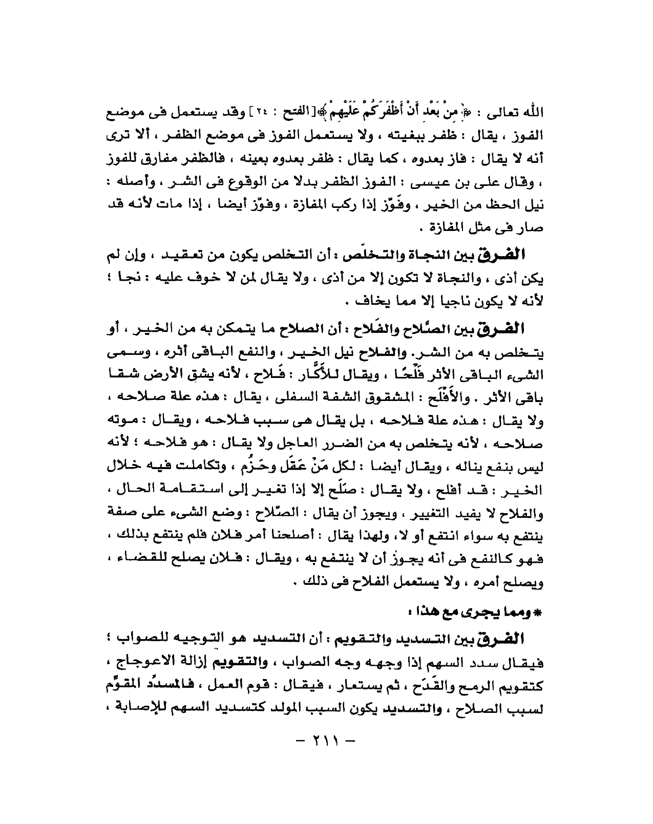 الله تَعَالَى (من بعد أَن أَظْفَرَكُم عَلَيْهِم) وَقد يسْتَعْمل مَوضِع الْفَوْز يُقَال ظفر ببغيته وَلَا يتسعمل الْفَوْز فِي مضوع الظفر أَلا ترى أَنه لَا يُقَال فَازَ بعدوه كَمَا يُقَال ظفر بعدوه بِعَيْنِه فالظفر مفارق للفوز وَقَالَ عَليّ بن عِيسَى الْفَوْز الظفر بَدَلا من الْوُقُوع فِي الشَّرّ وَأَصله نيل الْحَظ وَفَوْز إِذا ركب الْمَفَازَة وَفَوْز أَيْضا إِذا مَاتَ لِأَنَّهُ قد صَار فِي مثل الْمَفَازَة
