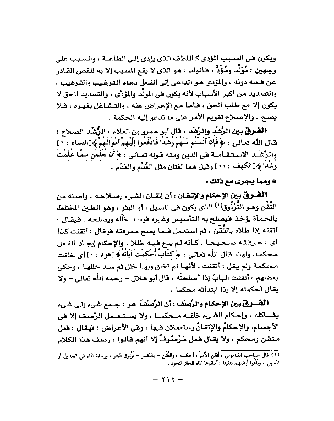 أَن إتقان الشَّيْء إِصْلَاحه وَأَصله من التقن وَهُوَ الترنوق الَّذِي يكون فِي المسيل أَو الْبِئْر وَهُوَ الطين المختلظ بالحمأة يُؤْخَذ فيصلح بِهِ التأسيس وَغَيره فيسد خلله ويصلحه فَيُقَال أتقنه إِذا طلاه بالتقن ثمَّ اسْتعْمل فِي مَا يَصح مَعْرفَته فَيُقَال أتقنت كَذَا أَي عَرفته صَحِيحا كَأَنَّهُ لم يدع فِيهِ خلالا والإحكام إِيجَاد الْفِعْل محكما وَلِهَذَا قَالَ الله تَعَالَى (كتاب أحكمت آيَاته) أَي خلقت محكمَة وَلم يقل أتقنت لِأَنَّهَا لم تخلق وَبهَا خلل ثمَّ سد خللها وَحكى بَعضهم أتقنت الْبَاب إِذا أصلحته قَالَ أَبُو هِلَال رَحمَه الله تَعَالَى وَلَا يُقَال أحكمته إِلَّا إِذا ابتدأته محكما