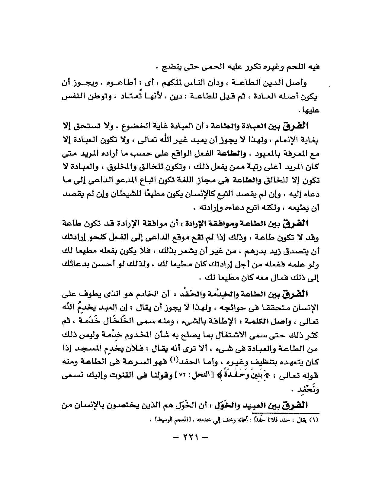 أَن الْعِبَادَة غَايَة الخضوع وَلَا تسْتَحقّ إِلَّا بفاية الإنعام وَلِهَذَا لَا يجوز أَن يعبد غير الله تَعَالَى وَلَا تكون الْعِبَادَة إِلَّا مَعَ الْمعرفَة بالمعبود وَالطَّاعَة الْفِعْل ذَلِك الْوَاقِع على حسب مَا أَرَادَهُ المريد مَتى كَانَ المريد أَعلَى رُتْبَة مِمَّن يفعل ذَلِك وَتَكون للخالق والمخلوق وَالْعِبَادَة لَا تكون إِلَّا للخالق وَالطَّاعَة فِي مجَاز اللُّغَة تكون اتِّبَاع الْمَدْعُو الدَّاعِي إِلَى مَا دَعَاهُ اليه وان لم يقْصد التبع كالانسان يكون مُطيعًا للشَّيْطَان وَإِن لم يقْصد أَن يطيعه وَلكنه ابتع دَعَاهُ وارادته