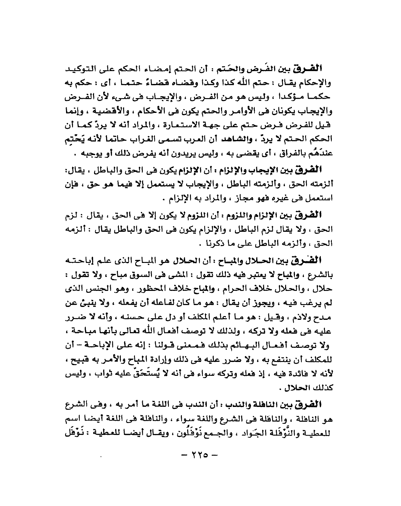 أَن الحتم إِمْضَاء الحكم على التوكيد والإحكام يُقَال حتم الله كَذَا وَكَذَا وقضاه قَضَاء حتما أَي حكم بِهِ حكما موكدا وَلَيْسَ هُوَ من الْفَرْض والإيجاب فِي شَيْء لِأَن الْفَرْض والإيجاب يكونَانِ فِي الْأَوَامِر والحتم يكون فِي الْأَحْكَام والأقضية وانما قيل للْفَرض قرض حتم على جِهَة الِاسْتِعَارَة وَالْمرَاد أَنه لَا يرد كَمَا أَن الحكم الحتم لَا يرد وَالشَّاهِد أَن الْعَرَب تسمي الْغُرَاب حاتما لِأَنَّهُ يحتم عِنْدهم بالفراق أَي يقْضِي وَلَيْسَ يُرِيدُونَ أَنه يفْرض ذَلِك أَو يُوجِبهُ