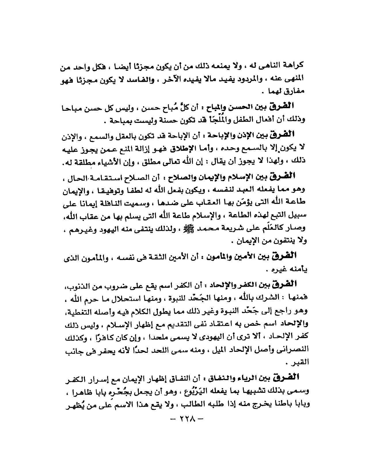 أَن الصّلاح استقامة الْحَال وَهُوَ مِمَّا يَفْعَله العَبْد لنَفسِهِ وَيكون بِفعل الله لَهُ لطفا وتوفيقا وَالْإِيمَان طَاعَة الَّتِي يُؤمن بهَا الْعقَاب على ضدها وَسميت النَّافِلَة إِيمَانًا على سَبِيل التبع لهَذِهِ الطَّاعَة والاسلام طَاعَة الله الَّتِي يسلم بهَا من عِقَاب الله وَصَارَ
