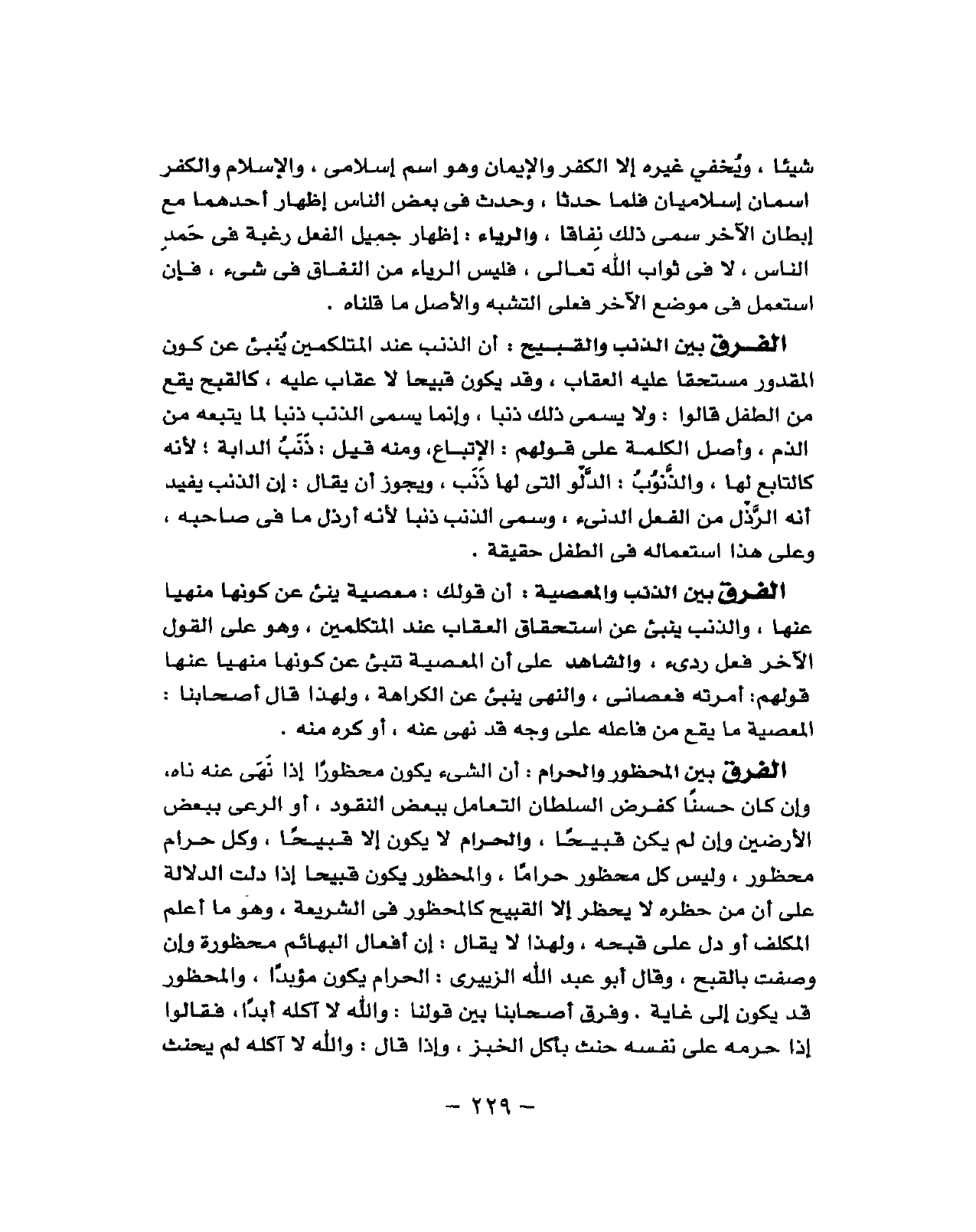 أَن الذَّنب عِنْد الْمُتَكَلِّمين ينبىء عَن كَون الْمَقْدُور مُسْتَحقّا عَلَيْهِ الْعقَاب وَقد يكون قبيحا لَا عِقَاب عَلَيْهِ كالقبح يَقع من الطِّفْل قَالُوا وَلَا يُسمى ذَلِك ذَنبا وَإِنَّمَا يُسمى الذَّنب ذَنبا لما يتبعهُ من الذَّم وأصل الْكَلِمَة على قَوْلهم الِاتِّبَاع وَمِنْه قيل ذَنْب الدَّابَّة لنه كالتابع والذنُوب الَّتِي لَهَا ذَنْب وَيجوز أَن يُقَال إِن الذَّنب يُفِيد أَنه