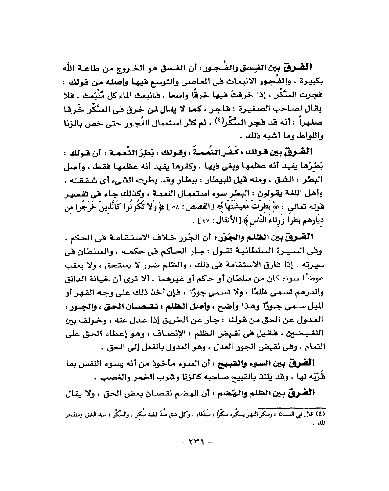 طَاعَة الله بكبيرة والفجور الانبعاث فِي الْمعاصِي والتوسع فِيهَا واصله من قولكت أفجرت السكر إِذا خرقت فِيهَا خرقا وَاسِعًا فانبعث المَاء كل منبعث فَلَا يُقَال لصَاحب الصَّغِير فَاجر كَمَا لَا يُقَال لمن خرق فِي السكر خرقا صَغِيرا أَنه قد فجر السكر ثمَّ كثر اسْتِعْمَال الْفُجُور حَتَّى خص بِالزِّنَا واللواط وَمَا أشبه ذَلِك