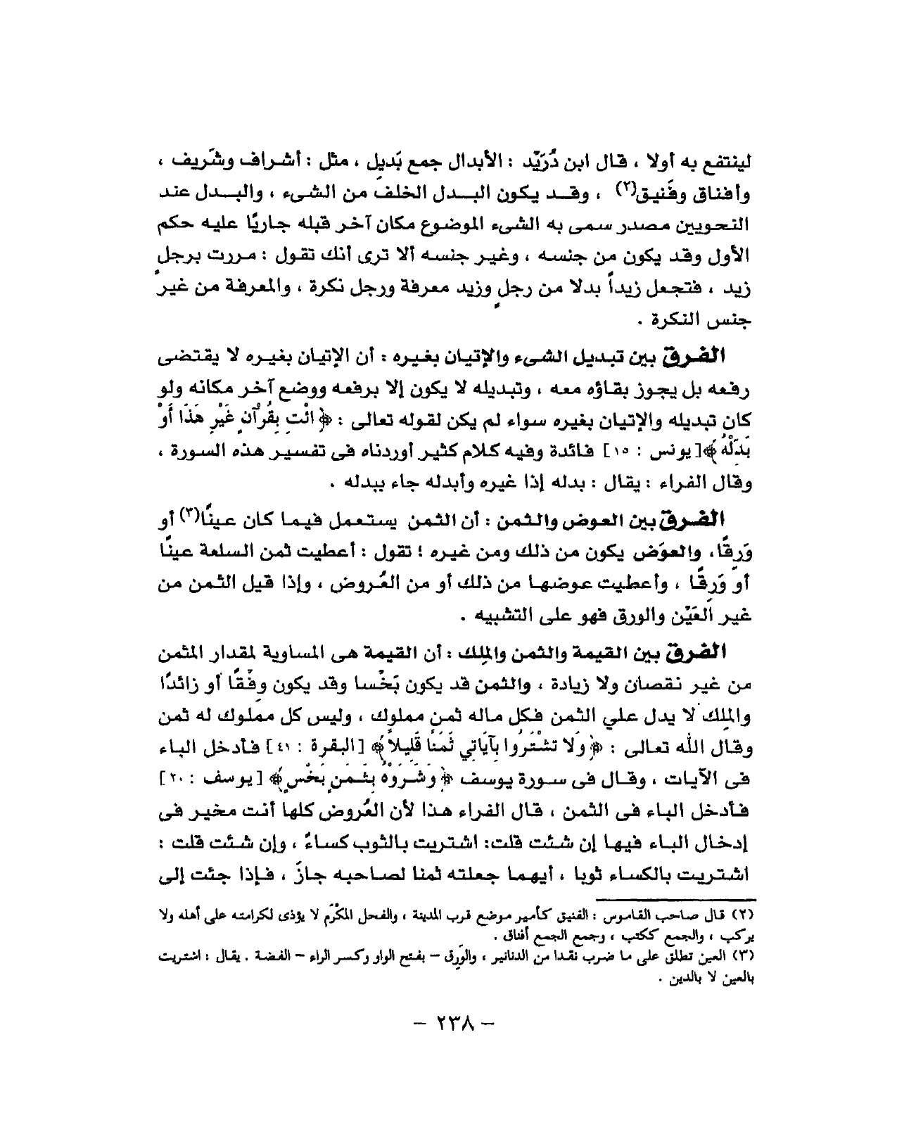 ثمن وَقَالَ الله تَعَالَى (وَلَا تشتروا بآياتي ثمنا قَلِيلا) فَأدْخل الْبَاء فِي الآيا وَقَالَ فِي سُورَة يُوسُف (وشروه بِثمن بخس) فَأدْخل الْبَاء فِي الثّمن قَالَ الْفراء هَذَا لِأَن الْعرُوض كلهَا أَنْت مُخَيّر فِي إِدْخَال الْبَاء فِيهَا إِن شِئْت قلت اشْتريت بِالثَّوْبِ كسَاء وَإِن شِئْت قلت اشْتريت بالكساء ثوبا أَيهمَا جعلته ثمنا لصَاحبه جَازَ فَإِذا جئت إلى