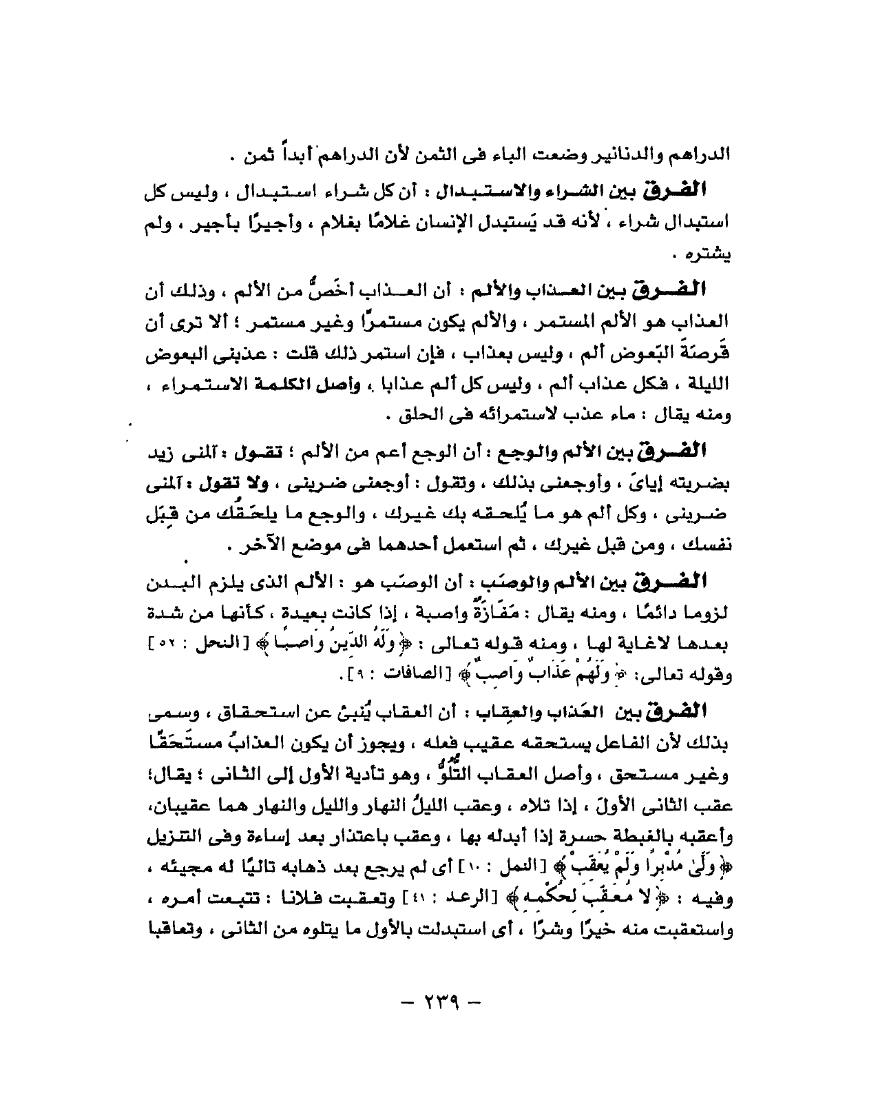 أَن الْعَذَاب أخص من الْأَلَم وَذَلِكَ أَن الْعَذَاب هُوَ الْأَلَم المستمر يكون سمتمرا وَغير مُسْتَمر أَلا ترى أَن قرصة البعوض ألم وَلَيْسَ بِعَذَاب فَإِن اسْتمرّ ذَلِك قلت عذبني البعوض اللَّيْلَة فَكل عَذَاب ألم وَلَيْسَ كل ألم عذَابا وأصل الْكَلِمَة الِاسْتِمْرَار وَمِنْه يُقَال مَاء عذب لاستمرائه فِي الْحلق