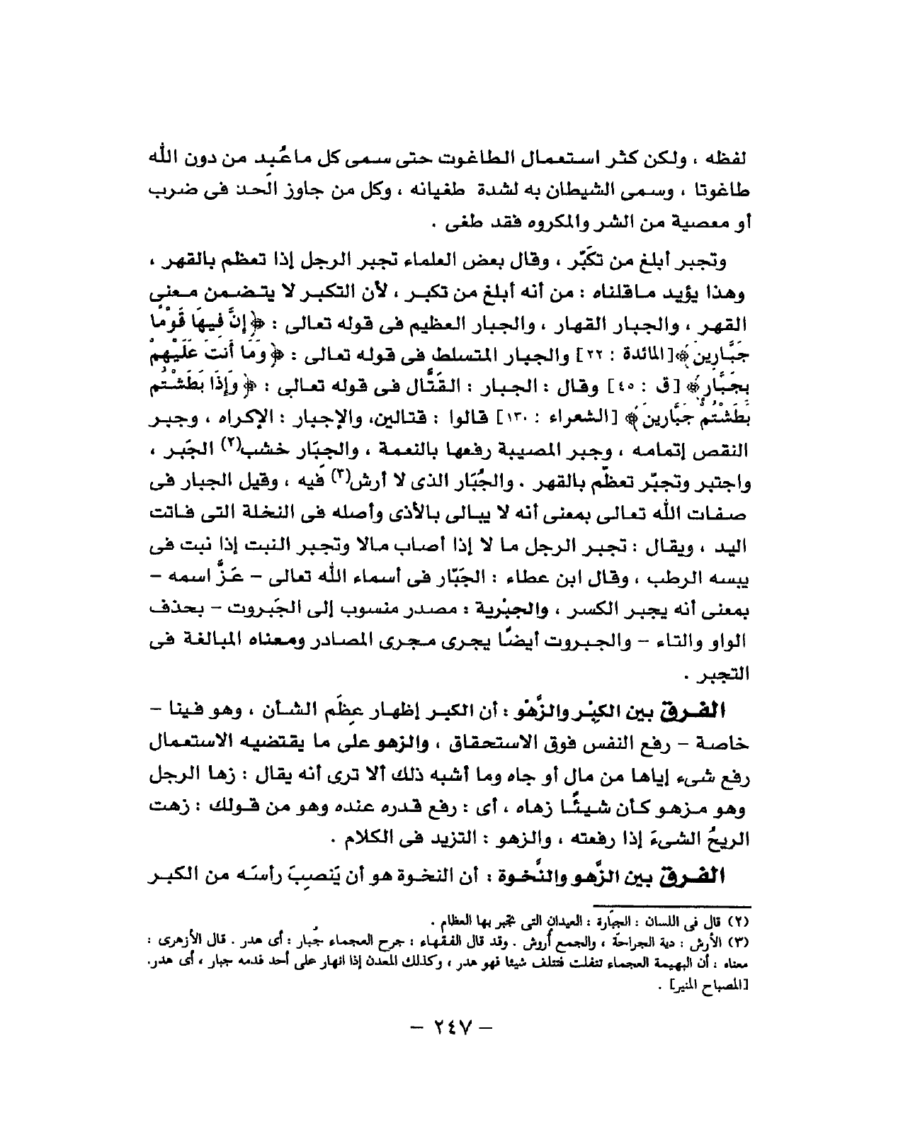 لَفظه وَكَذَلِكَ الطاغوت أبلغ من الطاغي لفخامة لَفظه وَلَكِن كثر اسْتِعْمَال الطاغوت حَتَّى سمي كل مَا عبد من دون الله طاغوتا وَسمي الشَّيْطَان بِهِ لشدَّة طغيانة وكل من جَاوز الْحَد فِي ضرب أَو مَعْصِيّة من الشَّرّ وَالْمَكْرُوه فقد طفى وتجبر أبلغ من تكبر وَقَالَ بعض الْعلمَاء تجبر الرجل إِذا تعظم بالقهر وَهَذَا يُؤَيّد مَا قُلْنَاهُ من انه أبلغ من تكبر لِأَن التكبر لَا يتَضَمَّن معنى الْقَهْر والجبار القهار والجبار الْعَظِيم فِي قَوْله تَعَالَى (إِن فِيهَا قوما جبارين) والجبار المتسلط فِي قَوْله تَعَالَى (وَإِذا بطشتم بطشتم جبارين) قَالُوا قتالين والإجبار الْإِكْرَاه وجبر النَّقْص إتمامة وجبر الْمُصِيبَة رفعا بِالنعْمَةِ والجبارة خشب الْجَبْر واجتبر واتجبر تعظم بالقهر والجبار الَّذِي لَا أرش فِيهِ وَقيل الْجَبَّار فِي صِفَات الله تَعَالَى بِمَعْنى أَنه لَا يُبَالِي بالأذى وَأَصله فِي النَّخْلَة الَّتِي فَاتَت الْيَد وَيُقَال تجبر الرجل مَالا إِذا أصَاب مَالا وتجبر النبت إِذا نبت فِي يايسة الرطب وَقَالَ ابْن عَطاء الْجَبَّار فِي أَسمَاء الله تَعَالَى جلّ اسْمه بِمَعْنى أَنه يجْبر الْكسر والجبرية مصدر مَنْسُوب إِلَى الجبروت بِحَذْف الْوَاو وَالتَّاء والجبروات أَيْضا يجْرِي مجْرى المصادر وَمَعْنَاهُ المبالقة فِي التجبر