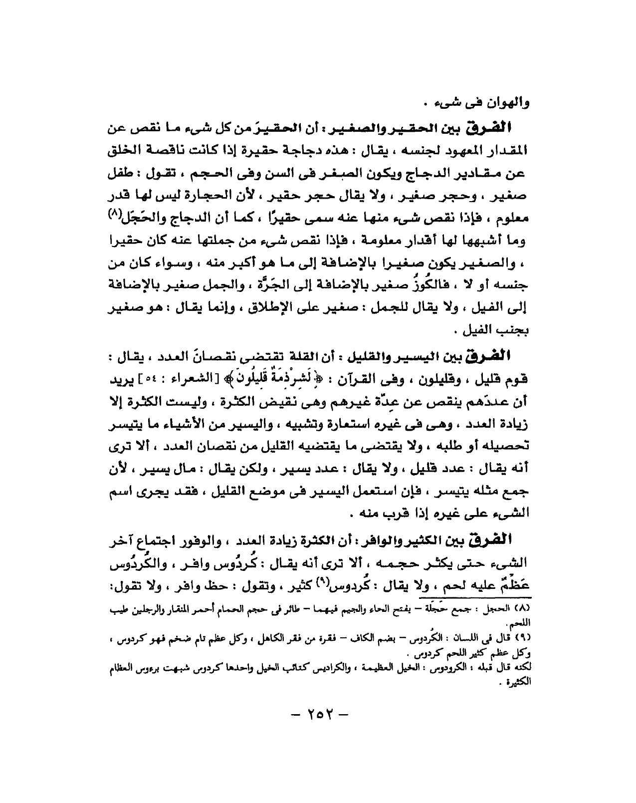 أَن الحقير من كل شَيْء مَا نقص عَن الْمِقْدَار الْمَعْهُود لجنسه يُقَال هَذِه دجَاجَة حقيرة إِذا كَانَت نَاقِصَة الْخلق عَن مقادير الدَّجَاج وَيكون الصغر فِي السن وَفِي الحجم تَقول طِفْل صَغِير وَحجر صَغِير وَلَا يُقَال حجر حقير لِأَن الْحِجَارَة لَيْسَ لَهَا قدر مَعْلُوم فَإِذا نقص شَيْء مِنْهَا عَنهُ سمي حقير كَمَا أَن الدَّجَاج والحجل وَمَا أشبههَا لَهَا أقدار مَعْلُومَة فَإِذا نقص شَيْء من جُمْلَتهَا عَنهُ مسي حَقِيرًا وَالصَّغِير يكون صَغِيرا بِالْإِضَافَة إِلَى مَا هُوَ أكبر مِنْهُ وَسَوَاء كَانَ من جنسه أَو لَا فالكوز صَغِير بِالْإِضَافَة إِلَى الجرة والجمل صَغِير بِالْإِضَافَة إِلَى الْفِيل وَلَا يقل للجمل صَغِير على الإطق وأنما يَقُول هُوَ صَغِير بِجنب الْفِيل