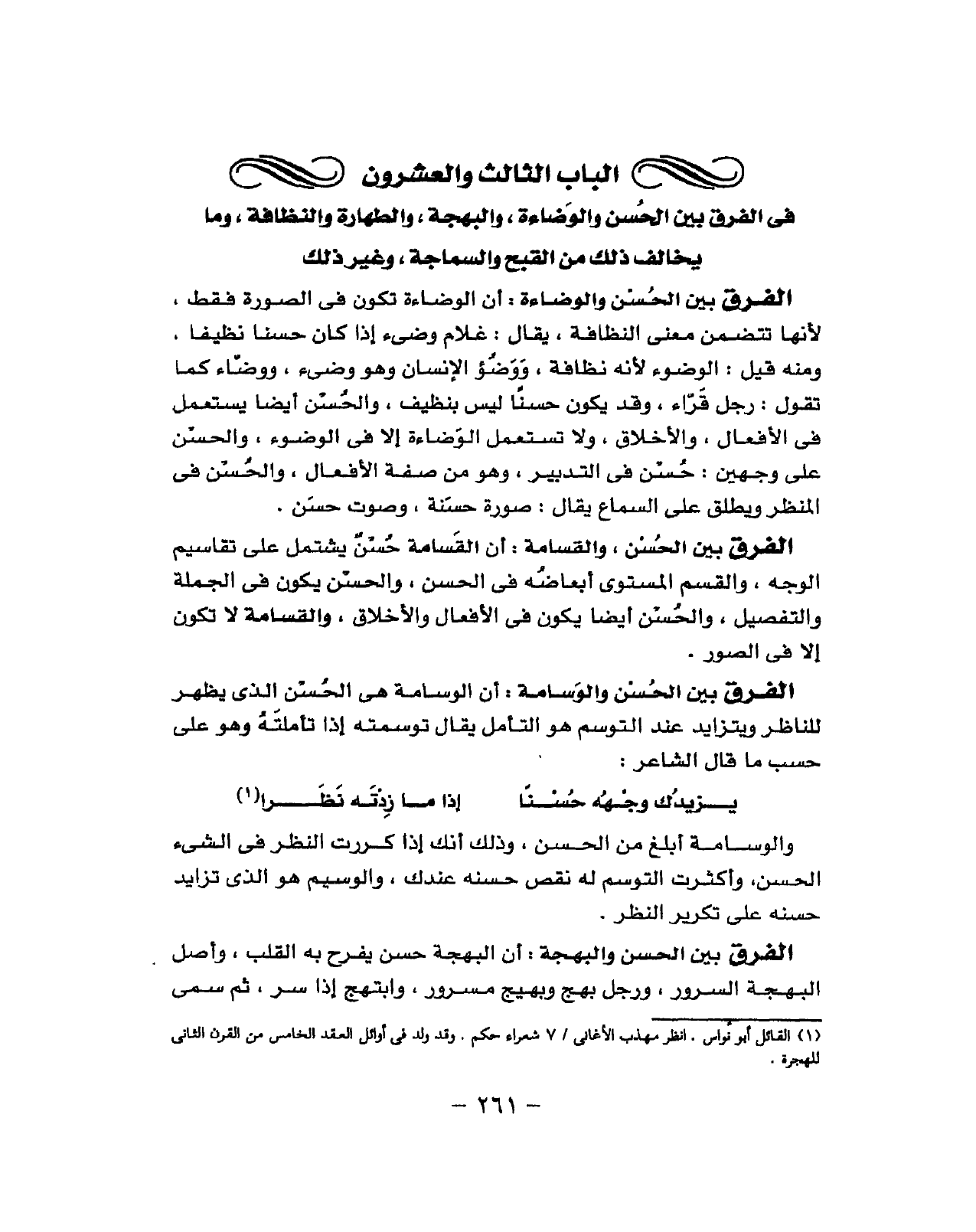 فِي الْفرق بَين الْحسن والوضاءة والبهجة وَالطَّهَارَة والنظافة وَمَا يُخَالف ذَلِك من الْقبْح والسماحة وَغير ذَلِك
