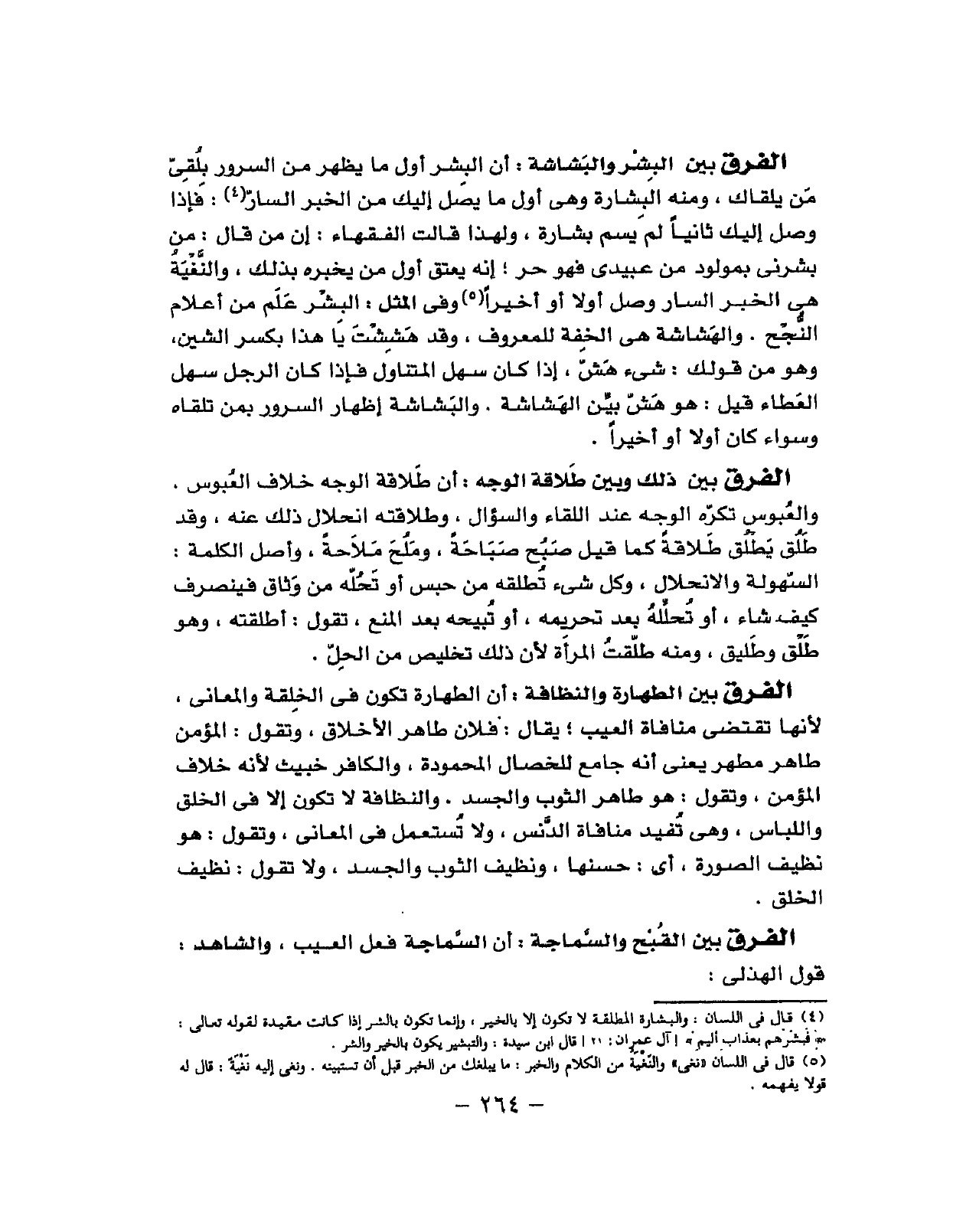 أَن الْبشر أول مَا يظْهر من السرُور بلقى من يلقاك وَمِنْه الْبشَارَة وَهِي أول مَا يصل اليك من الْخَبَر السار فَإِذا وصل إِلَيْك ثَانِيًا لم يسم بِشَارَة وَلِهَذَا قَالَت الْفُقَهَاء إِن من قَالَ من بشرني بمولود من عَبِيدِي فَهُوَ حر فَإِنَّهُ يعْتق أول من يُخبرهُ بذلك والنغية هِيَ الْخَبَر السار وصل أَولا أَو أخيرا وَفِي الْمثل الْبشر علم من أَعْلَام النجح والهشاشة هِيَ الخفة للمعروف وَقد هششت يَا هَذَا بِكَسْر الشين وَهُوَ من قَوْلك شَيْء هش إِذا كَانَ سهل المتناول فاذا كَانَ الرجل سهل الْعَطاء قيل هُوَ هش بَين الهشاشة والبشاشة إِظْهَار السرُور بِمن تَلقاهُ وَسَوَاء كَانَ أَولا أَو أخيرا