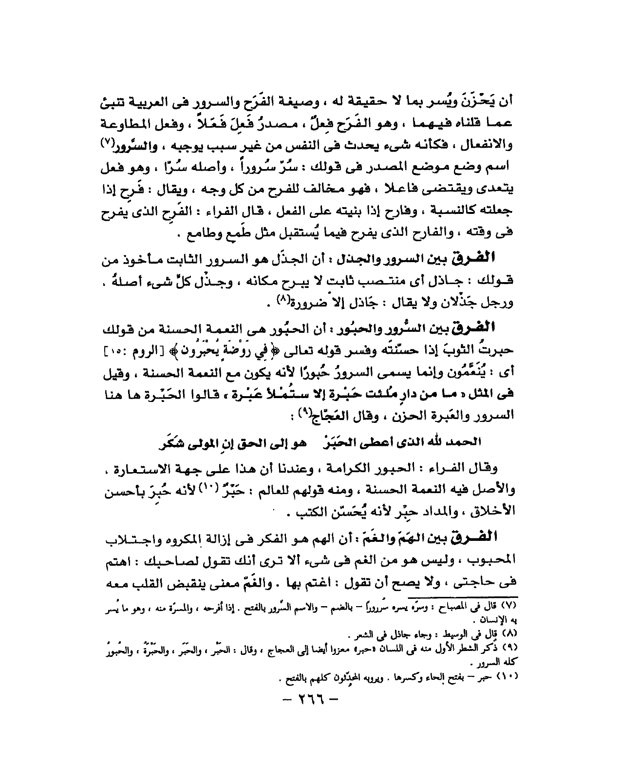 أَن يحزن وَيسر بِمَا لَا حَقِيقَة لَهُ صويفة الْفَرح وَالسُّرُور فِي الْعَرَبيَّة تنبىء عَمَّا قُلْنَاهُ فيهمَا وَهُوَ أَن الْفَرح فعل مصدر فعل فعلا وَفعل المطاوعة والانفعال فَكَانهُ شَيْء يحدث فِي الْفَرح فعل مصدر فعل فعلا وَفعل المطاوعة والانفعال فَكَأَنَّهُ شَيْء يحدث فِي النَّفس من غير سَبَب يُوجِبهُ وَالسُّرُور اسْم وضع مَوضِع الْمصدر فِي قَوْلك سر سُرُورًا وَهُوَ فعل يتَعَدَّى وَيَقْتَضِي فَاعِلا فَهُوَ مُخَالف للفرح من كل وَجه وَيُقَال فَرح إِذا جعلته كالنسبة وفارح إِذا بنيته على الْفِعْل قَالَ الْفراء الْفَرح الَّذِي يفرح فِي وقته والفارح الَّذِي يفرح فِي مَا يسْتَقْبل مثل طمع وطامع
