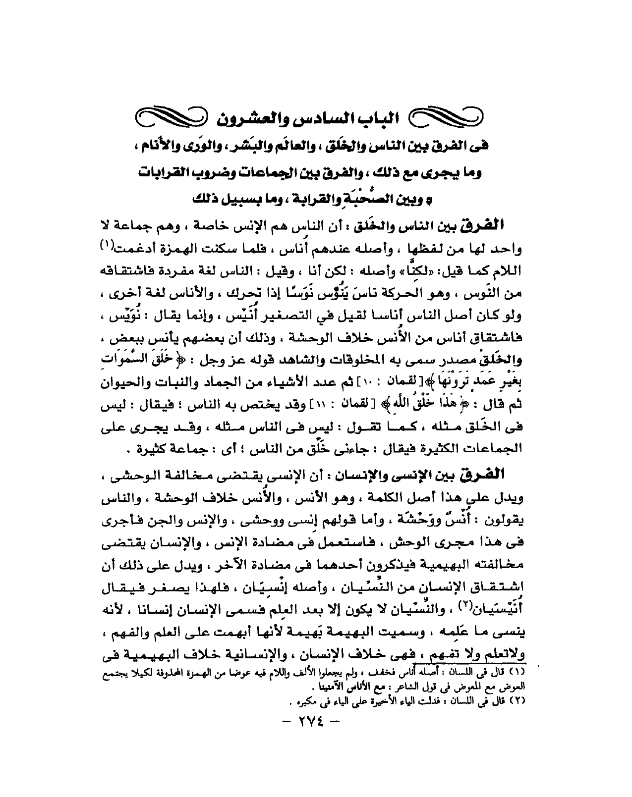 فِي الْفرق بَين النَّاس والخلق والعالم والبشر والورى والأنام وَمَا يجْرِي مَعَ ذَلِك وَالْفرق بَين الْجَمَاعَات وضروب الْقرَابَات وَبَين الصُّحْبَة والقرابة وَمَا بسبيل ذَلِك