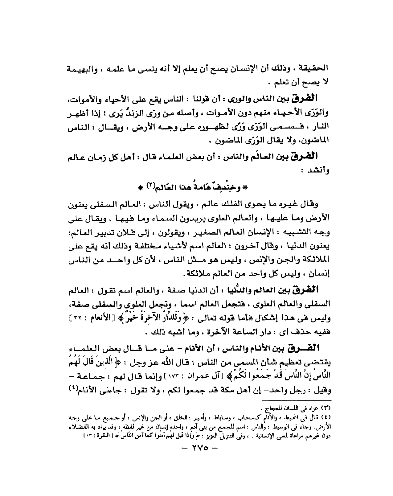 أَن قَوْلنَا النَّاس يَقع على الْأَحْيَاء والأموات والورى الْأَحْيَاء مِنْهُم دون الْأَمْوَات وَأَصله من وروى الزند يري إِذْ أظهر الناء فَسُمي الورى وروى لظهره على وَجه الأَرْض وَيُقَال النَّاس الماضون وَلَا يُقَال الورى الماضون