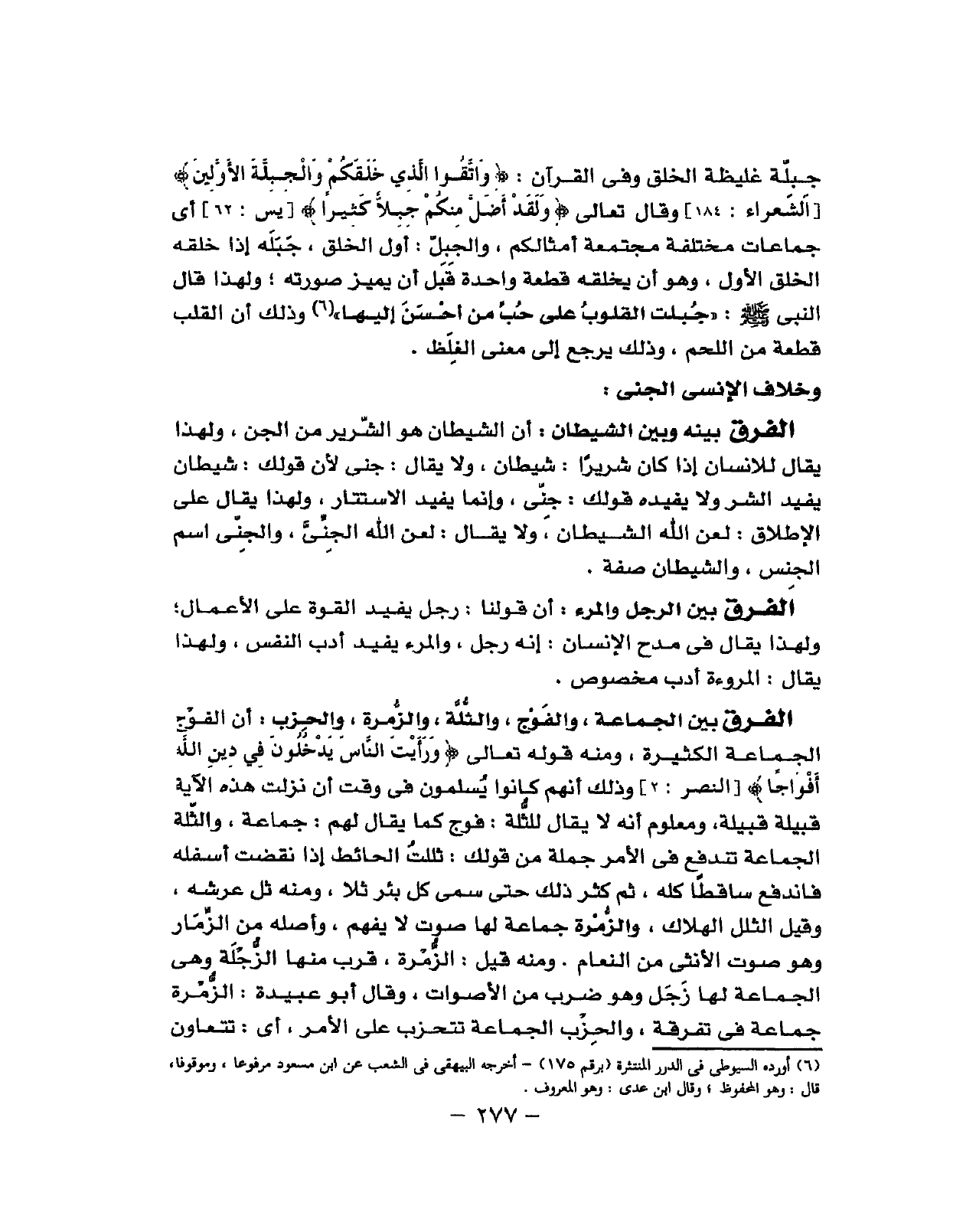 أَن الشَّيْطَان هُوَ الشرير من الْجِنّ وَلِهَذَا يُقَال للْإنْسَان إِذا كَانَ شريرا شَيْطَان وَلَا يُقَال جني لِأَن قَوْلك شَيْطَان يُفِيد الشَّرّ وَلَا يفِيدهُ قَوْلك جني وَإِنَّمَا يُفِيد الاستتار وَلِهَذَا يُقَال على الاطلاق لعن الله الشَّيْطَان وَلَا يُقَال لعن الله الجني والجني اسْم الْجِنْس والشيطان صفة