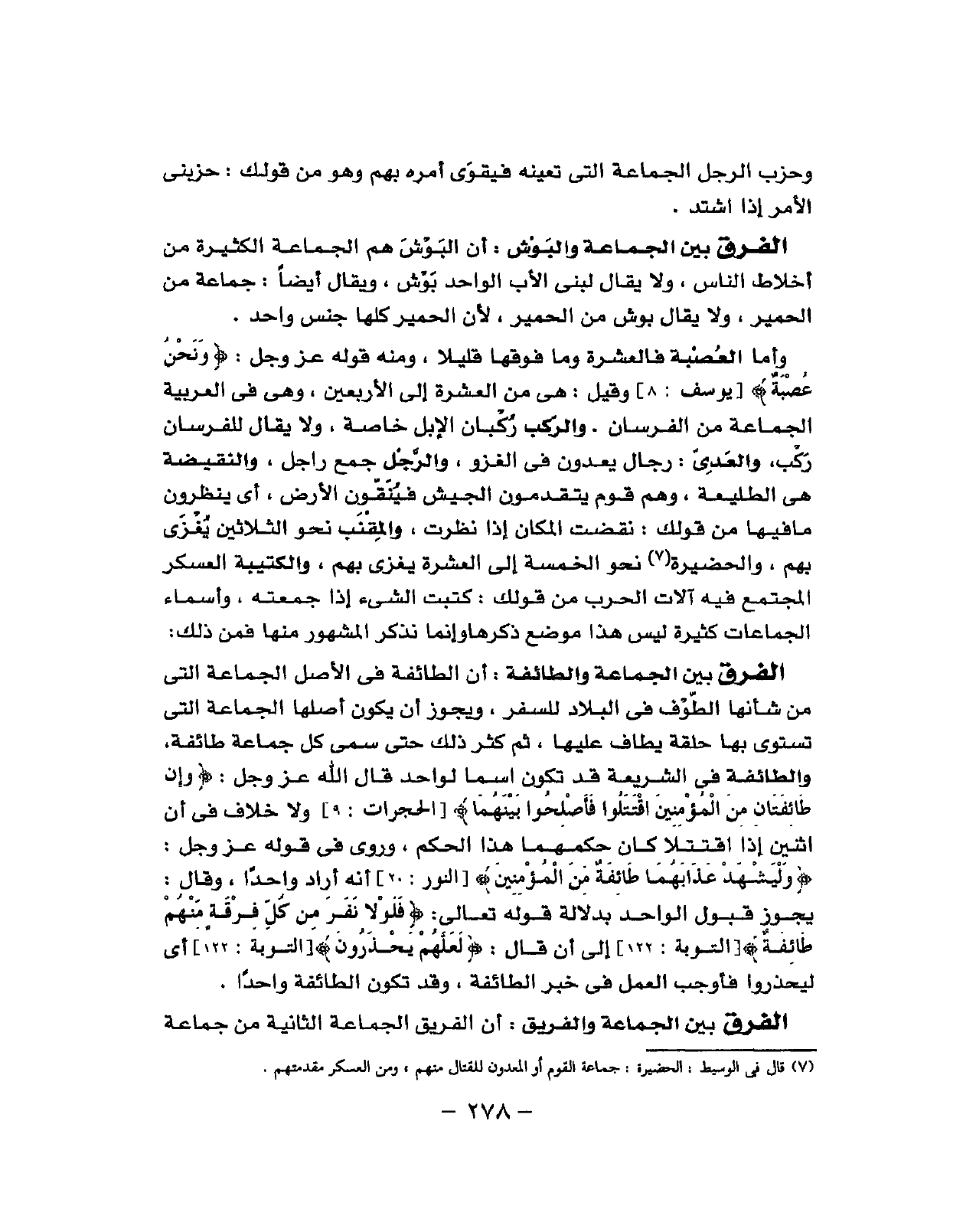 أَن البوش هم الْجَمَاعَة الْكَثِيرَة من أخلاط النَّاس وَلَا يُقَال لبني الْأَب الْوَاحِد بوش وَيُقَال أَيْضا جمَاعَة من الْحمير وَلَا يُقَال بوش من الْحمير لِأَن الْحمير كلهَا جنس وَاحِد وَأما الْعصبَة فالعشرة وَمَا فَوْقهَا قَلِيل وَمِنْه قَوْله عز وَجل (وَنحن عصبَة) وَقيل هِيَ من الْعشْرَة إِلَى الْأَرْبَعين وَهِي فِي الْعَرَبيَّة الْجَمَاعَة من الفرسان الركب ركبان الْإِبِل خَاصَّة وَلَا يُقَال للفرسان ركب والعدي رجال يعدون فِي الْغَزْو وَالرجل جمع راجل والنفيضة هِيَ الطليعة وهم قوم يتقدمون الْجَيْش فينفضون الأَرْض أَي ينطرون مَا فيا من قَوْلك نفضت الْمَكَان إِذا