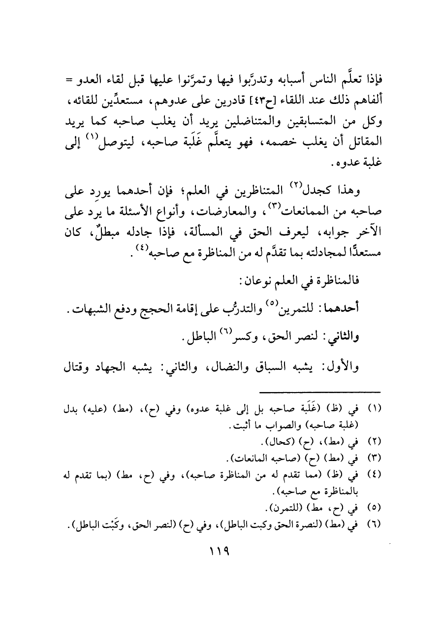 فإذا تعلَّم الناس أسبابه وتدرَّبوا فيها وتمرَّنوا عليها قبل لقاء العدو = ألفاهم ذلك عند اللقاء [ح ٤٣] قادرين على عدوهم، مستعدِّين للقائه، وكل من المتسابقين والمتناضلين يريد أن يغلب صاحبه كما يريد المقاتل أن يغلب خصمه، فهو يتعلَّم غَلَبة صاحبه، ليتوصل (¬١) إلى غلبة عدوه.