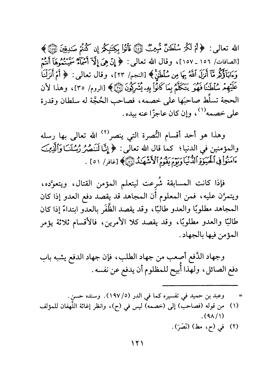الله تعالى: {أَمْ لَكُمْ سُلْطَانٌ مُبِينٌ (١٥٦) فَأْتُوا بِكِتَابِكُمْ إِنْ كُنْتُمْ صَادِقِينَ (١٥٧)} [الصافات: ١٥٦ - ١٥٧]، وقال الله تعالى: {إِنْ هِيَ إِلَّا أَسْمَاءٌ سَمَّيْتُمُوهَا أَنْتُمْ وَآبَاؤُكُمْ مَا أَنْزَلَ اللَّهُ بِهَا مِنْ سُلْطَانٍ} [النجم: ٢٣]، وقال تعالى: {أَمْ أَنْزَلْنَا عَلَيْهِمْ سُلْطَانًا فَهُوَ يَتَكَلَّمُ بِمَا كَانُوا بِهِ يُشْرِكُونَ (٣٥)} [الروم: ٣٥]، وهذا لأن الحجة تسلِّط صاحبَها على خصمه، فصاحب الحُجَّة له سلطان وقدرة على خصمه (¬١)، وإن كان عاجزًا عنه بيده.