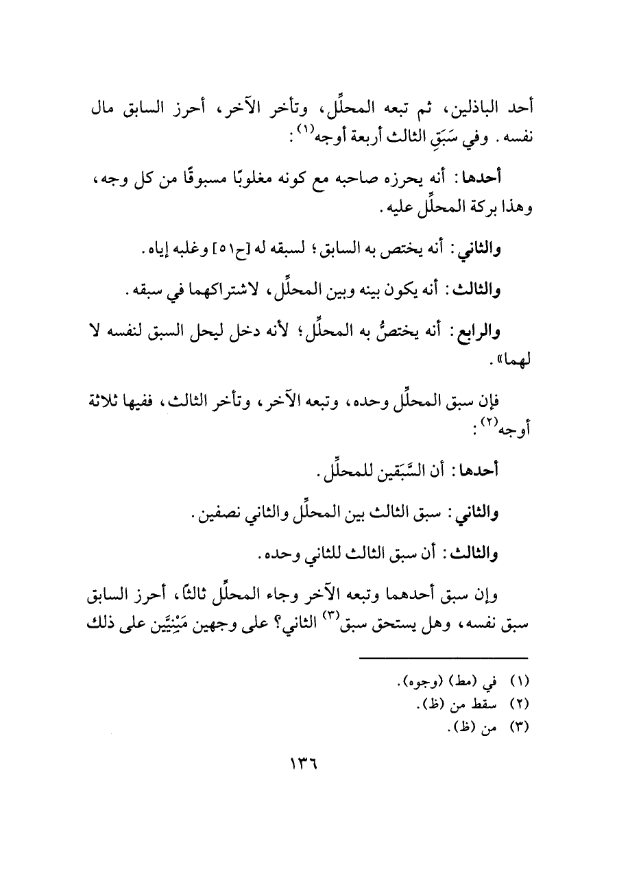 أحد الباذلين، ثم تبعه المحلِّل، وتأخر الآخر، أحرز السابق مال نفسه. وفي سَبَقِ الثالث أربعة أوجه (¬١):