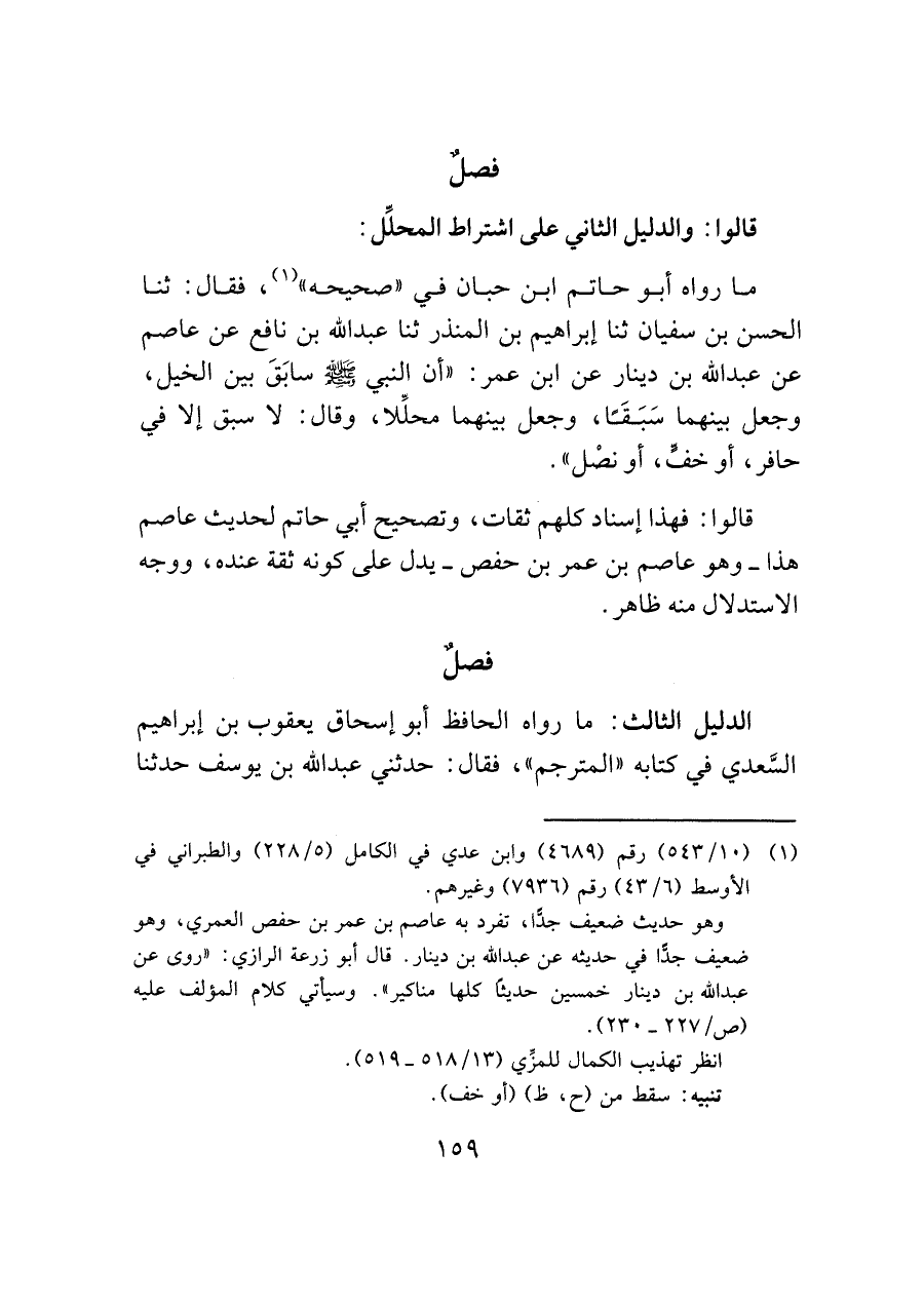 ما رواه أبو حاتم ابن حبان في "صحيحه" (¬١)، فقال: ثنا الحسن بن سفيان ثنا إبراهيم بن المنذر ثنا عبد الله بن نافع عن عاصم عن عبد الله بن دينار عن ابن عمر: "أن النبي - صلى الله عليه وسلم - سابَقَ بين الخيل، وجعل بينهما سَبَقًا، وجعل بينهما محلِّلا، وقال: لا سبق إلا في حافر، أو خفٍّ، أو نصْل".