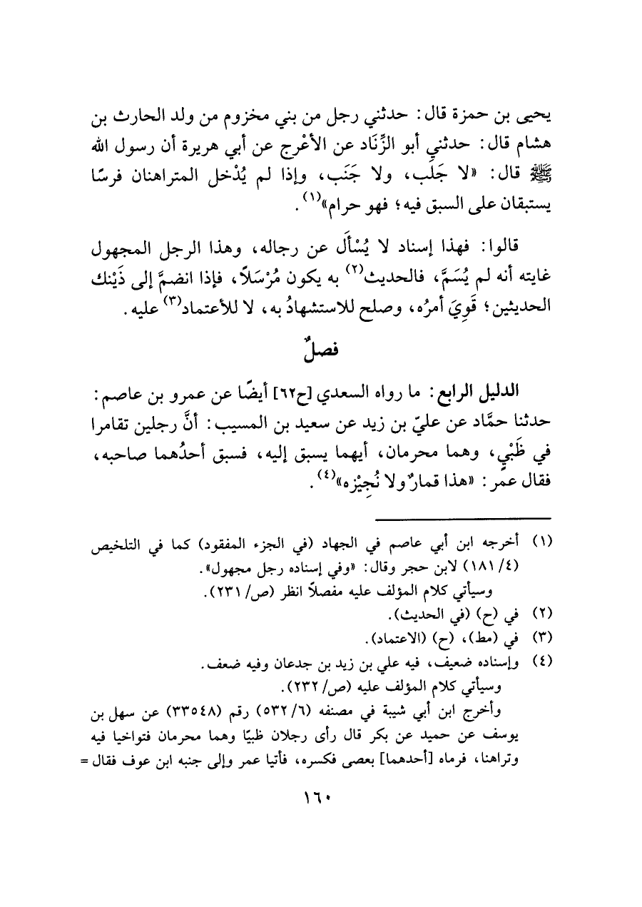 الدليل الرابع: ما رواه السعدي [ح ٦٢] أيضًا عن عمرو بن عاصم: حدثنا حمَّاد عن عليّ بن زيد عن سعيد بن المسيب: أنَّ رجلين تقامرا في ظَبْيٍ، وهما محرمان، أيهما يسبق إليه، فسبق أحدُهما صاحبه، فقال عمر: "هذا قمارٌ ولا نُجِيْزه" (¬٤).