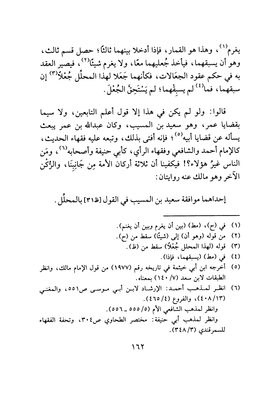 قالوا: ولو لم يكن في هذا إلا قول أعلم التابعين، ولا سيما بقضايا عمر، وهو سعيد بن المسيب، وكان عبد الله بن عمر يبعث يسأله عن قضايا أبيه (¬٥)؛ فإنه أفتى بذلك، وتبعه عليه فقهاء الحديث، كالإمام أحمد والشافعي وفقهاء الرأي، كأبي حنيفة وأصحابه (¬٦)، ومَن الناس غيرُ هؤلاء؟! فيكفينا أن ثلاثة أركان الأمة مِن جَانِبِنَا، والرُّكْن الآخر وهو مالك عنه روايتان:
