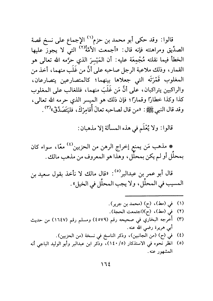 قالوا: وقد حكى أبو محمد بن حزم (¬١) الإجماع على نسخ قصة الصدِّيق ومراهنته فإنه قال: "أجمعت الأمَّةُ (¬٢) التي لا يجوز عليها الخطأ فيما نقلته مُجْمِعَة عليه: أن المَيْسِرَ الذي حرَّمه الله تعالى هو القمار، وذلك ملاعبة الرجل صاحبه على أنَّ من غَلَب منهما، أخذ من المغلوب قَمْرَتَه التي جعلاها بينهما؛ كالمتصارعين يتصارعان، والراكبين يتراكبان، على أنَّ مَن غَلَبَ منهما، فللغالب على المغلوب كذا وكذا خطارًا وقمارًا؛ فإن ذلك هو الميسر الذي حرمه الله تعالى، وقد قال النبي - صلى الله عليه وسلم -: "من قال لصاحبه تعالَ أُقامِرْكَ، فليَتَصَدَّقْ" (¬٣).