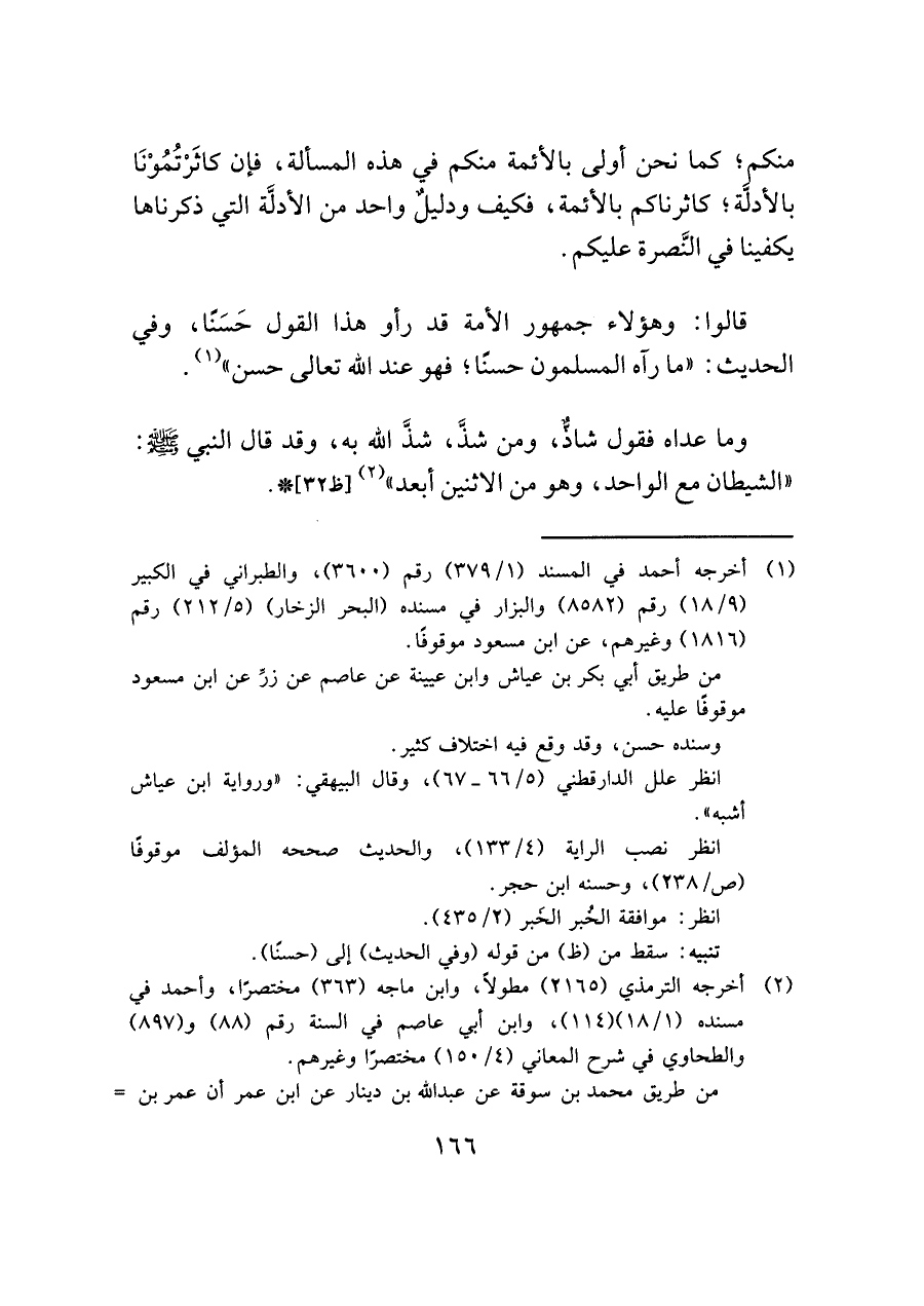 قالوا: وهؤلاء جمهور الأمة قد رأو هذا القول حَسَنًا، وفي الحديث: "ما رآه المسلمون حسنًا؛ فهو عند الله تعالى حسن" (¬١).