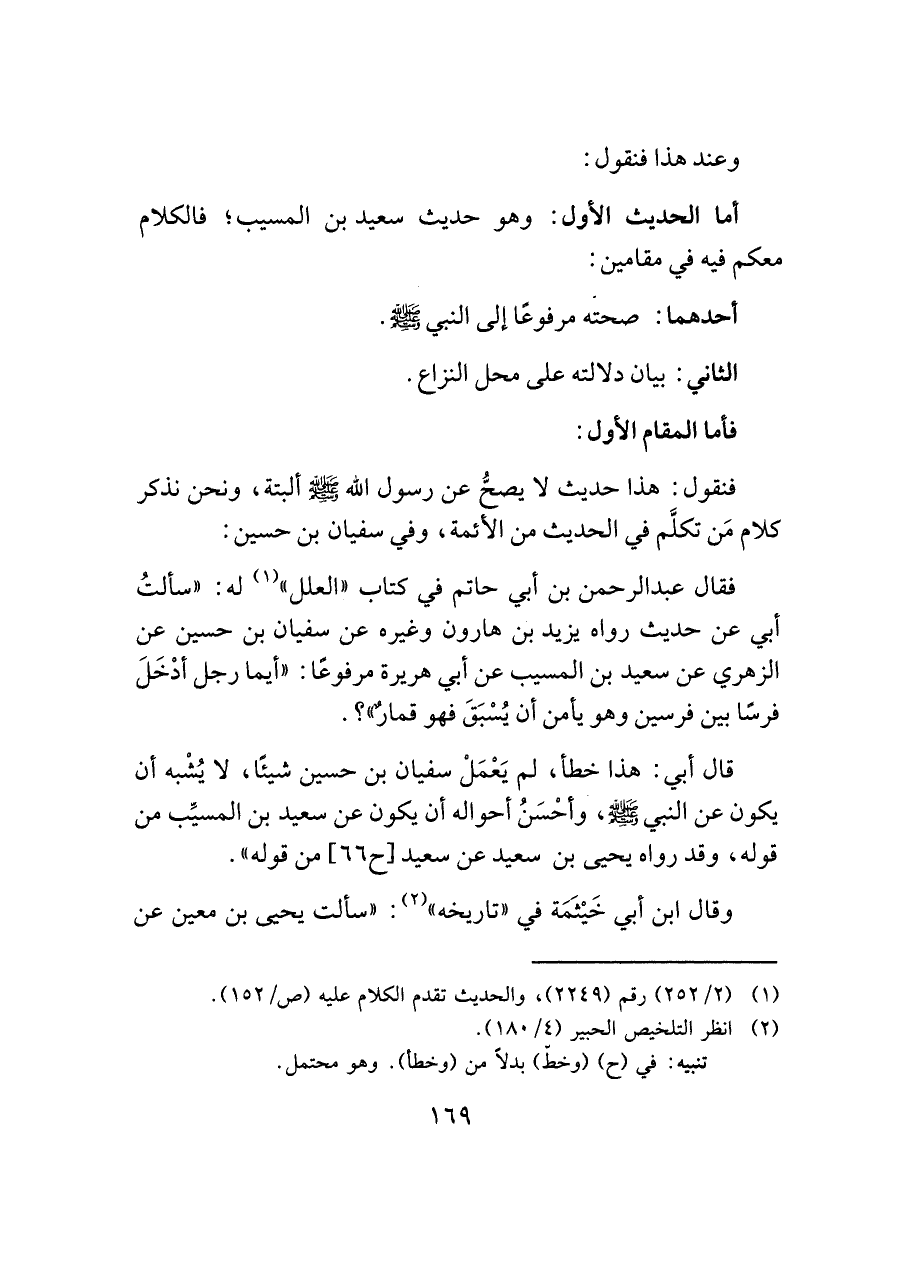 أما الحديث الأول: وهو حديث سعيد بن المسيب؛ فالكلام معكم فيه في مقامين:
