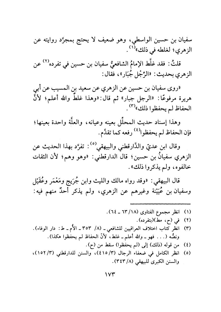 "روى سفيان بن حسين عن الزهري عن سعيد بن المسيب عن أبي هريرة مرفوعًا: "الرجل جبار" ثم قال: "وهذا غلطٌ والله أعلم؛ لأنَّ الحفاظ لم يحفظوا ذلك" (¬٣).