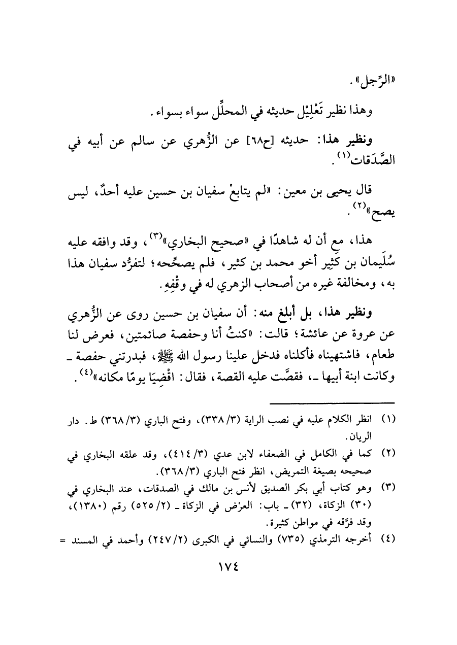 ونظير هذا، بل أبلغ منه: أن سفيان بن حسين روى عن الزُّهري عن عروة عن عائشة؛ قالت: "كنتُ أنا وحفصة صائمتين، فعرض لنا طعام، فاشتهيناه فأكلناه فدخل علينا رسول الله - صلى الله عليه وسلم -، فبدرتني حفصة - وكانت ابنة أبيها -، فقصَّت عليه القصة، فقال: اقْضِيَا يومًا مكانه" (¬٤).